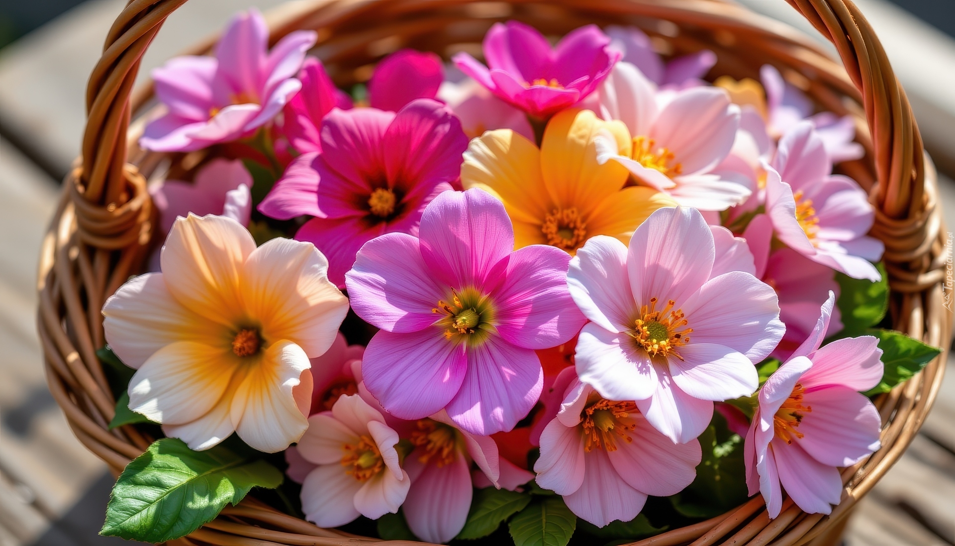 Edytor tapety: Rozświetlone kolorowe kwiaty w wiklinowym koszyku