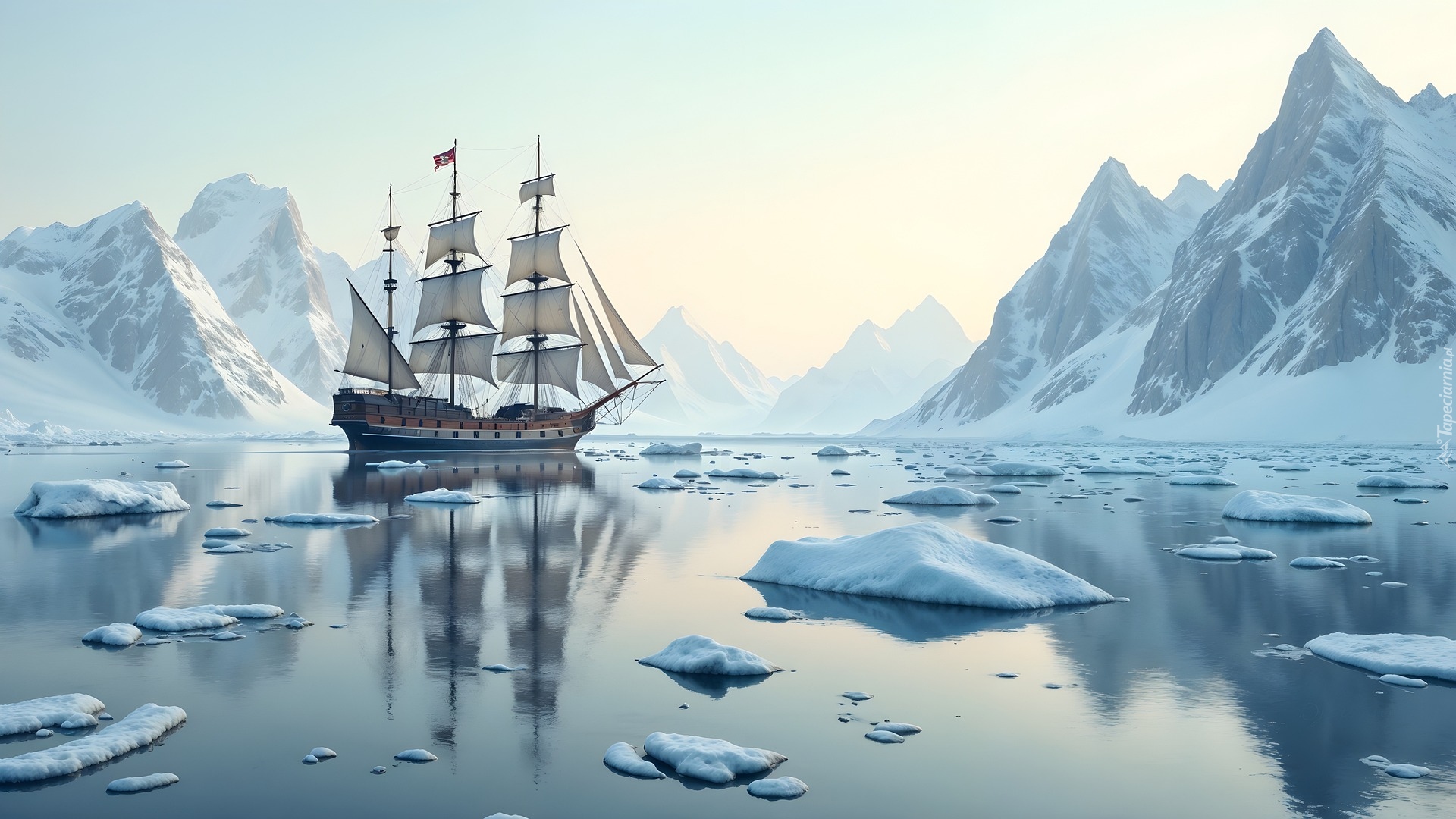 Edytor tapety: Żaglowiec na morzu obok ośnieżonych gór