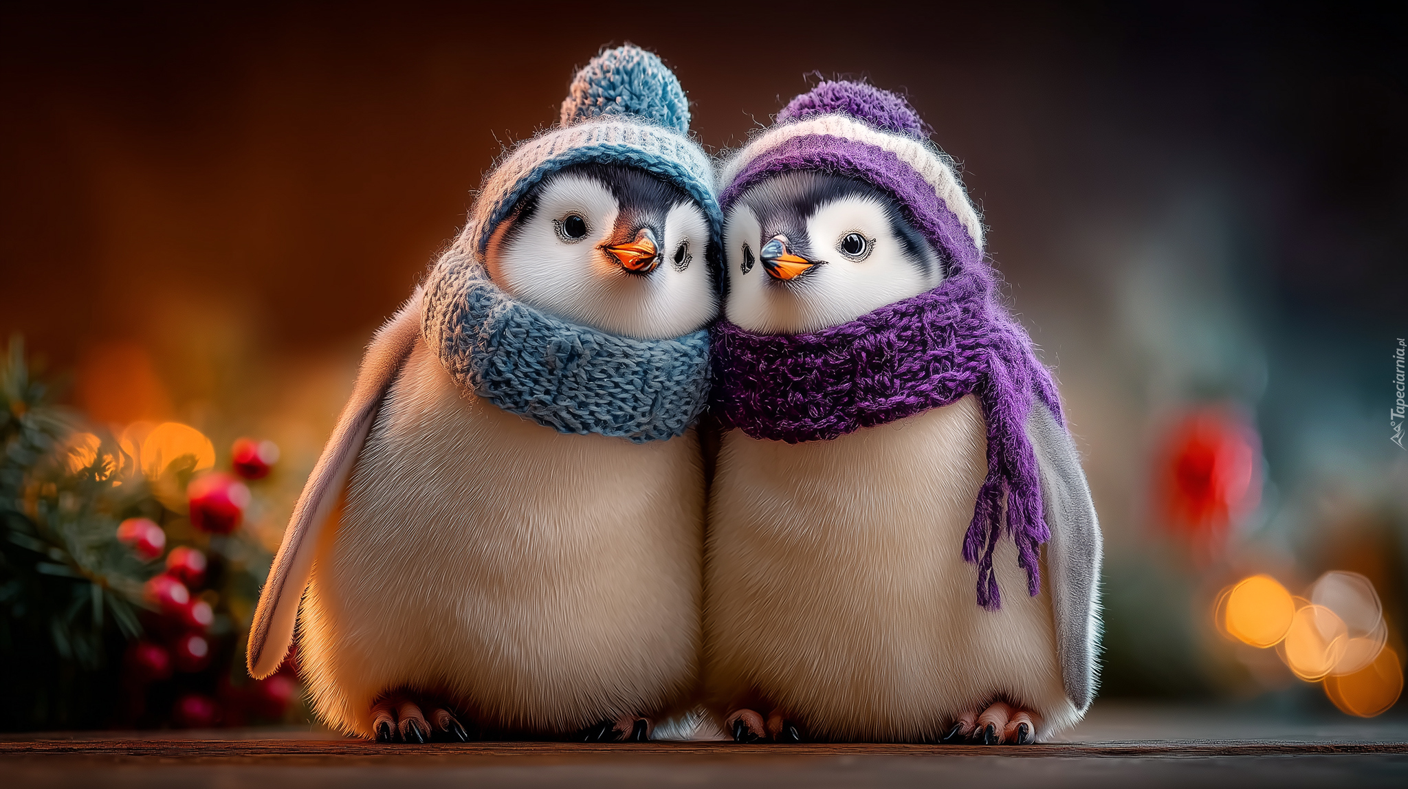 Edytor tapety: Dwa przytulone pingwiny w czapkach i szalikach