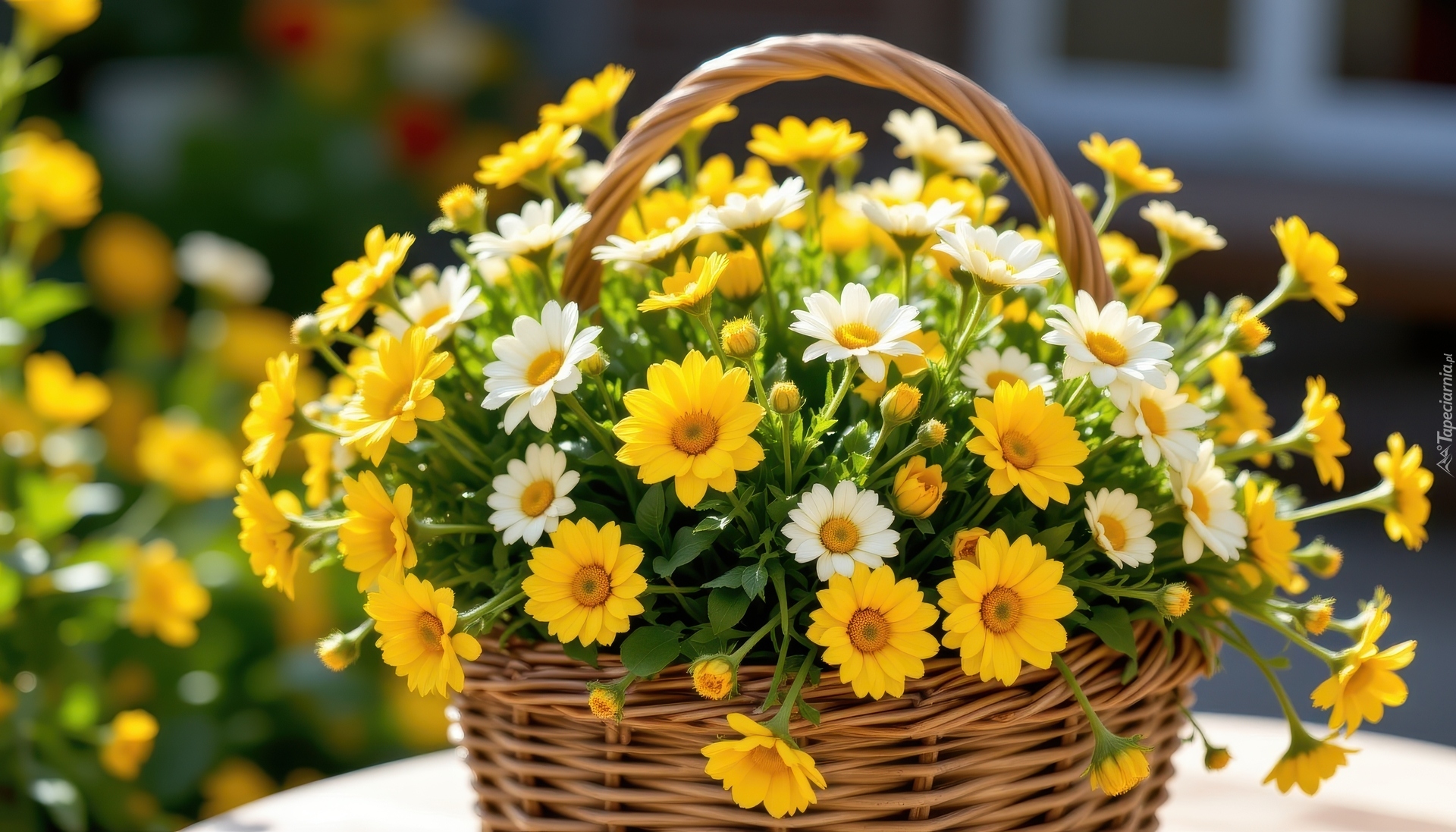 Edytor tapety: Rozświetlone żółte i białe kwiaty w wiklinowym koszyku