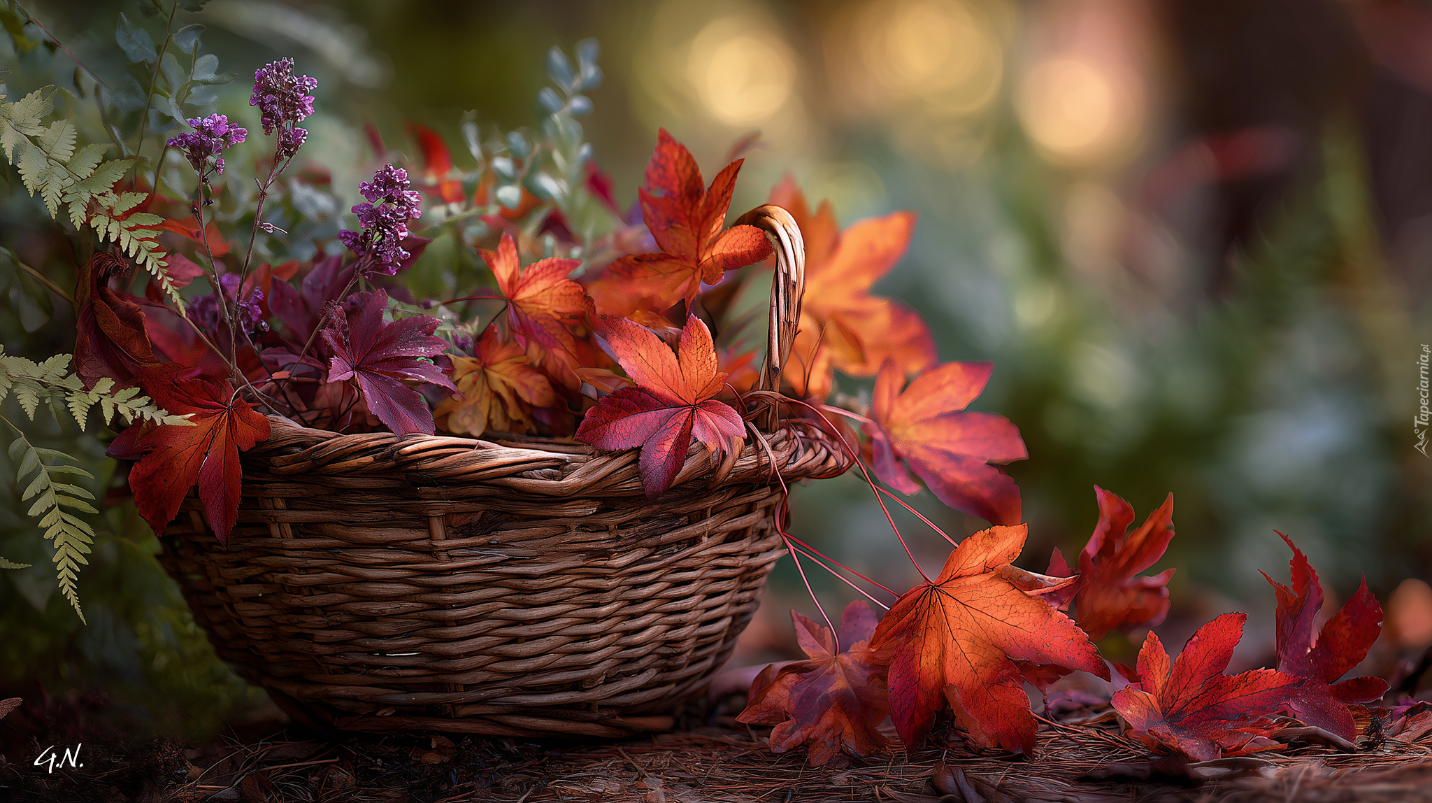 Edytor tapety: Czerwone jesienne liście i kwiaty w koszyku