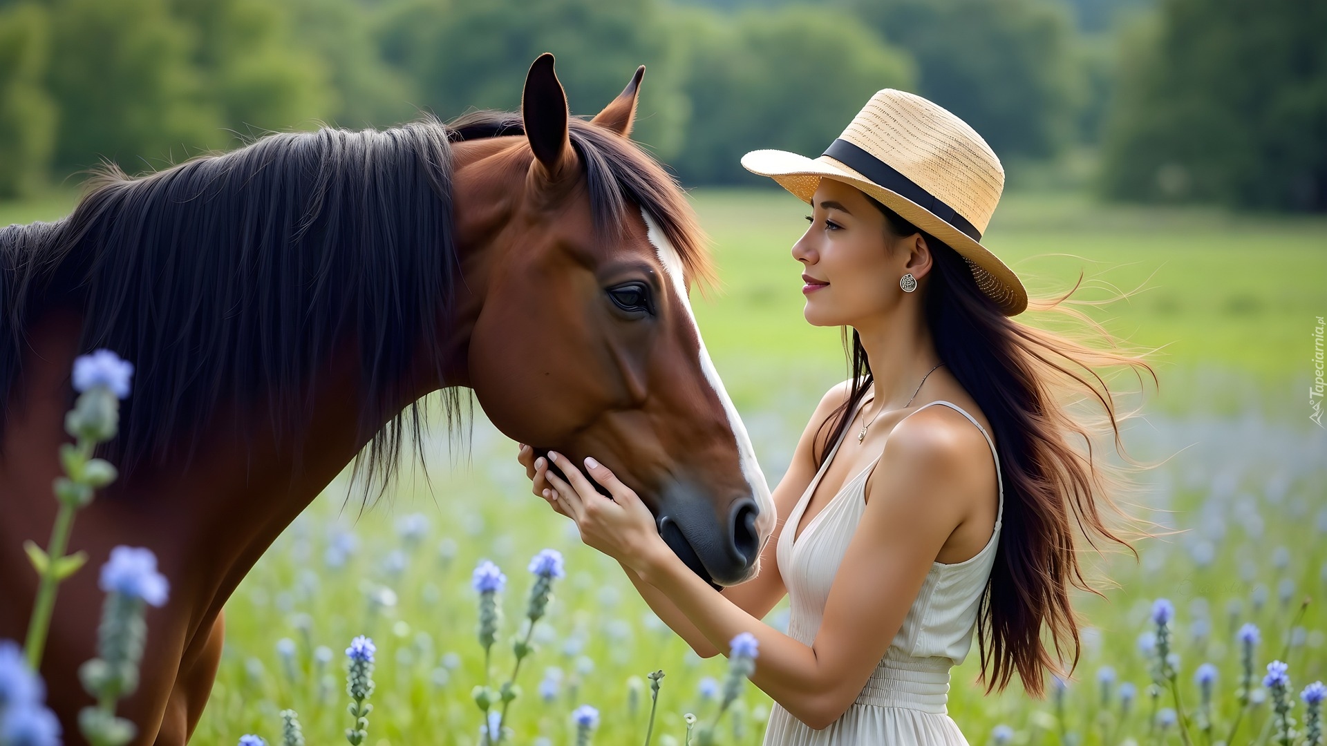 Edytor tapety: Szatynka w kapeluszu z brązowym koniem na łące