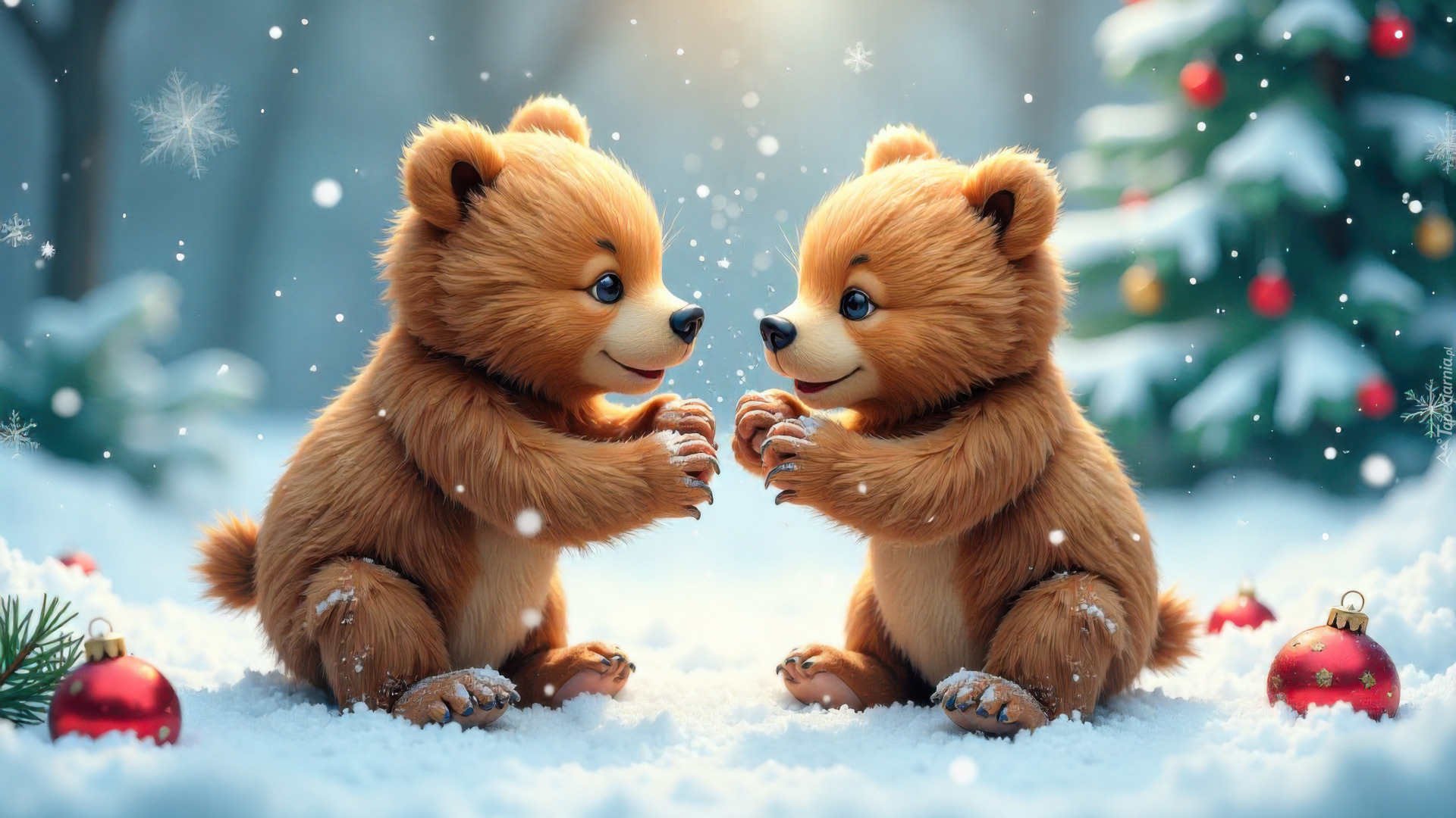 Edytor tapety: Dwa niedźwiadki na śniegu obok czerwonych bombek