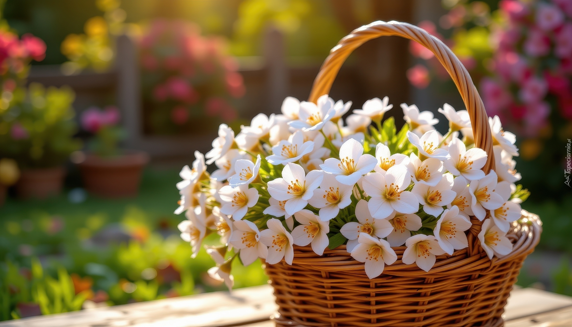 Edytor tapety: Rozświetlone białe kwiaty w wiklinowym koszyku