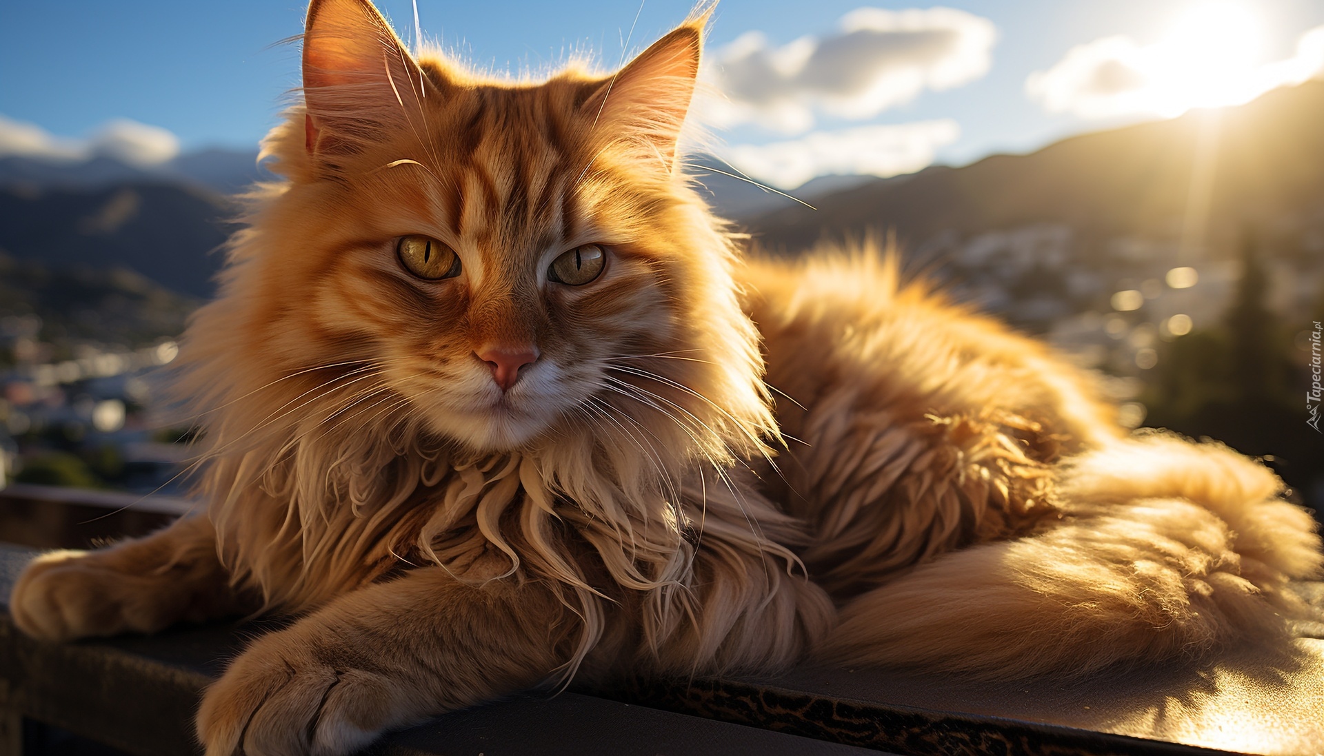 Edytor tapety: Spojrzenie rudego puszystego kota leżącego w słonecznym blasku