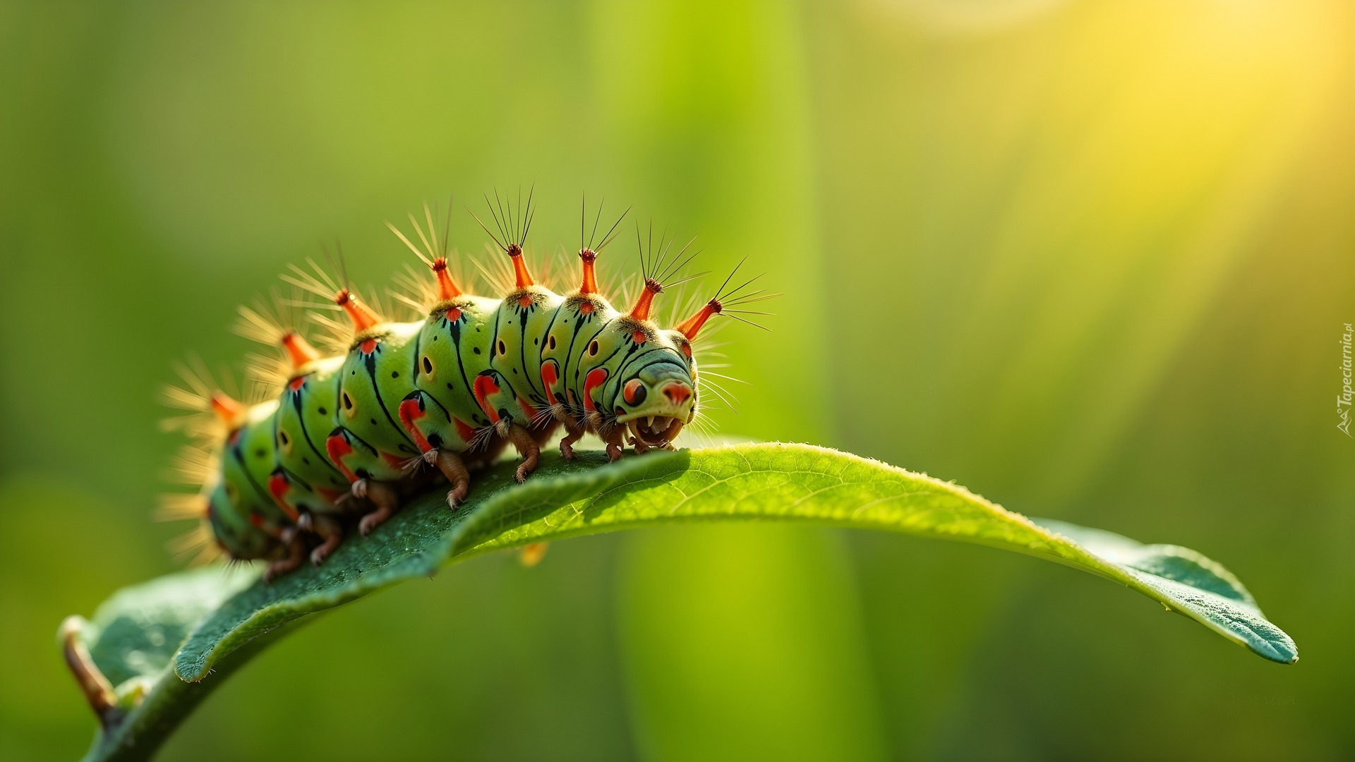 Edytor tapety: Zielono-pomarańczowa gąsienica na zielonym liściu w zbliżeniu