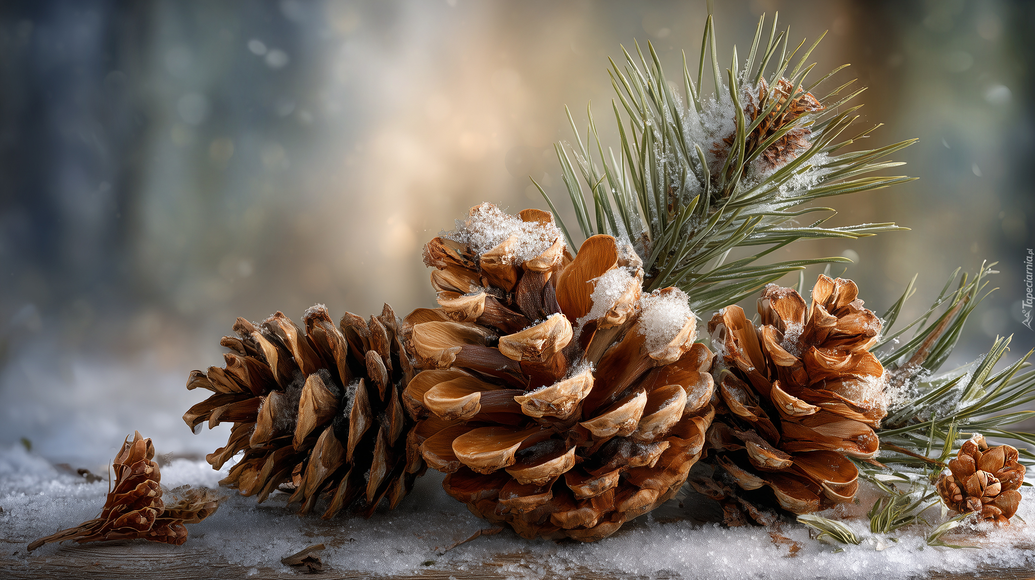 Edytor tapety: Ośnieżone szyszki i sosnowe gałązki na śniegu