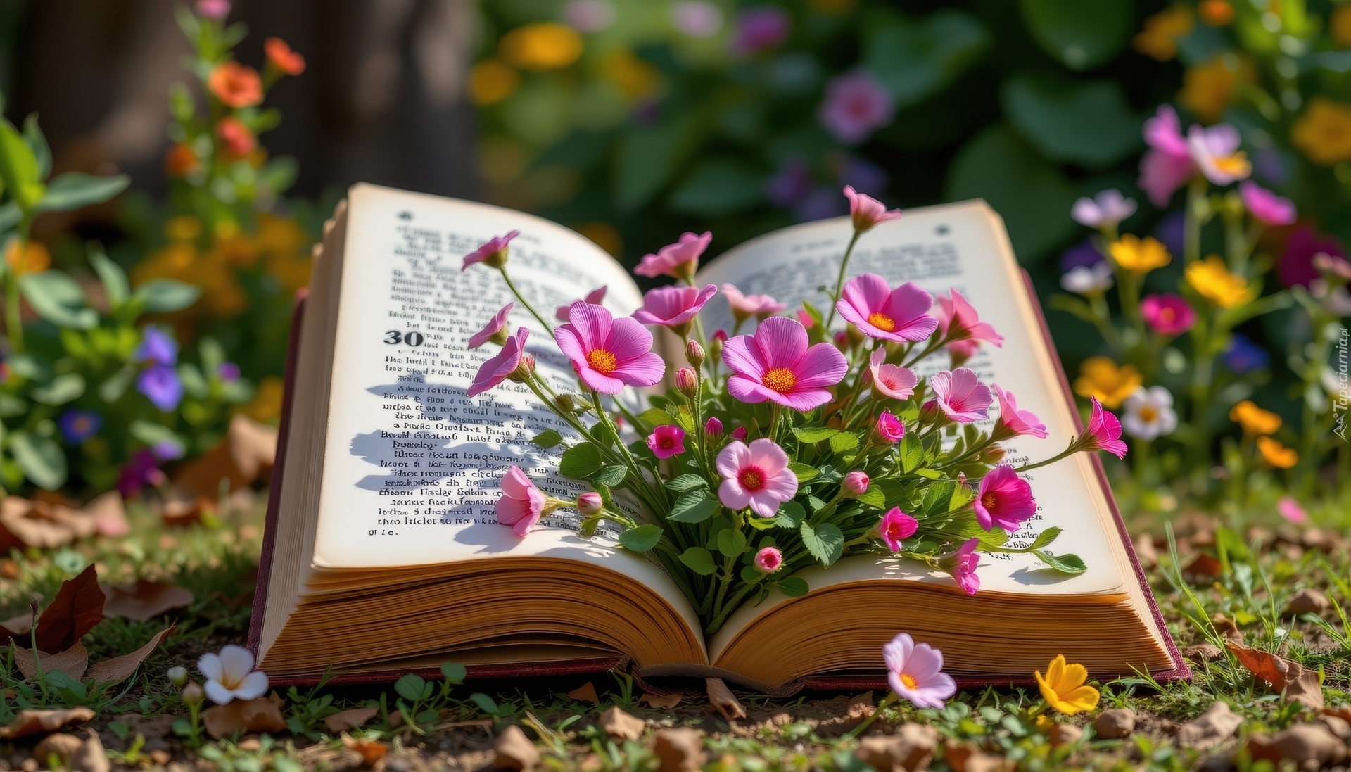 Edytor tapety: Różowe kwiaty na otwartej książce
