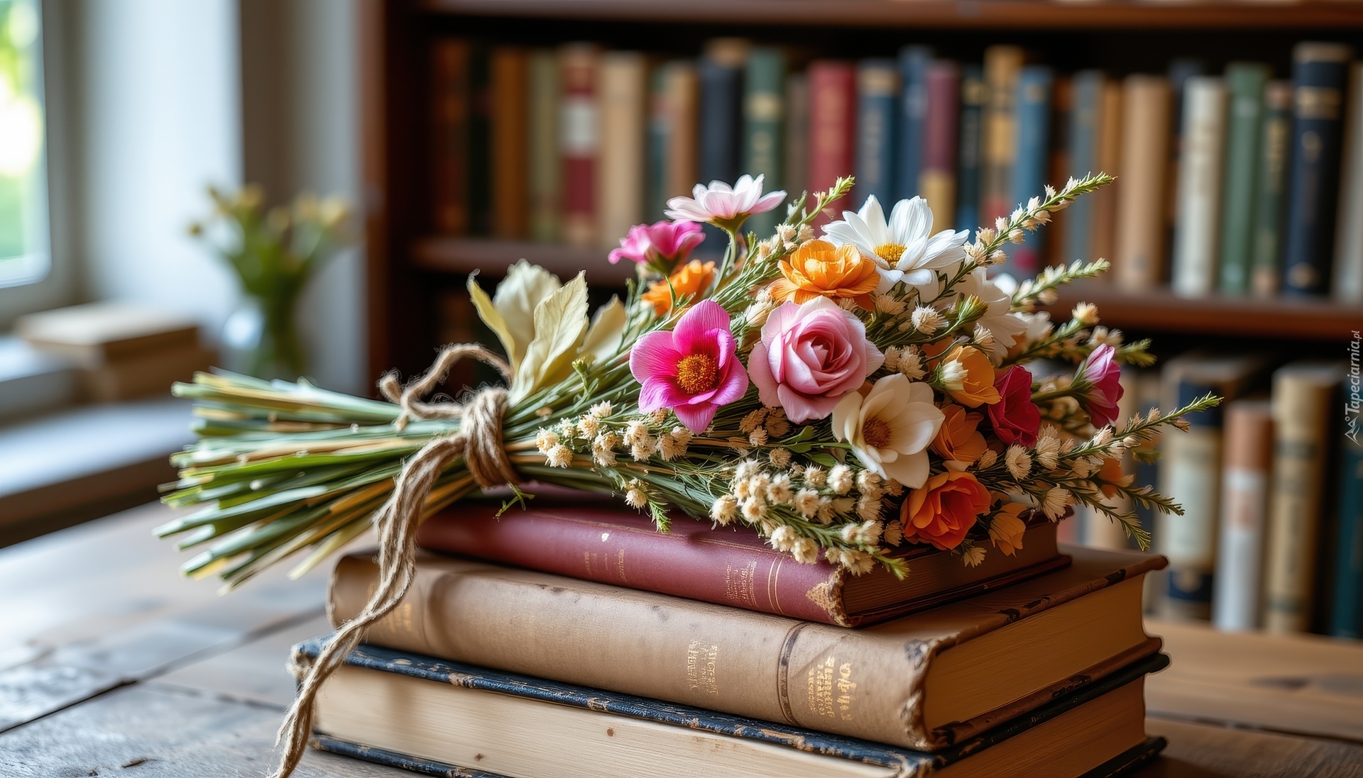 Edytor tapety: Bukiet kolorowych kwiatów na książkach