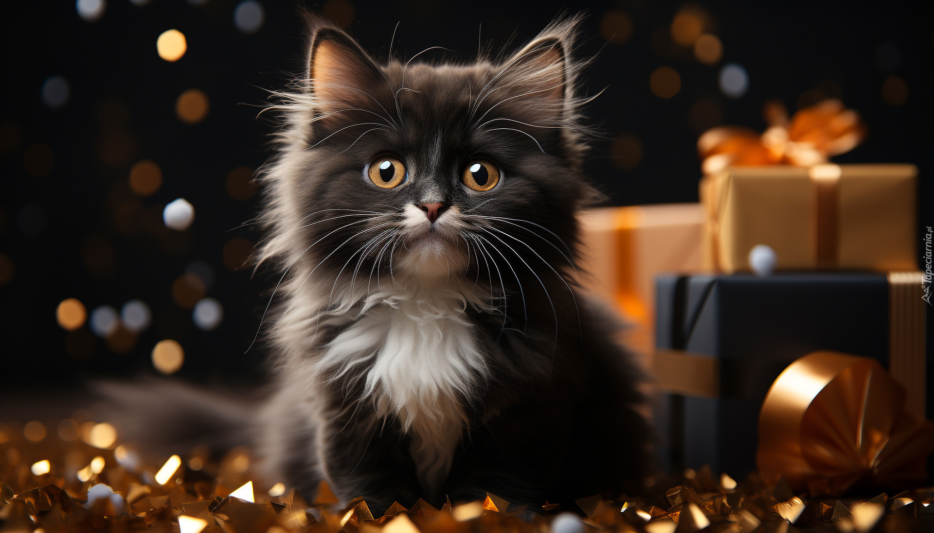 Edytor tapety: Czarno-biały kotek obok prezentów