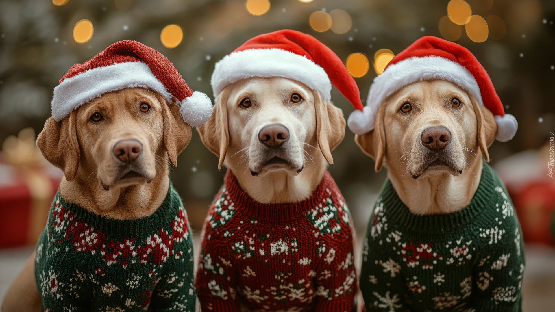 Edytor tapety: Trzy psy w czapkach mikołaja i swetrach