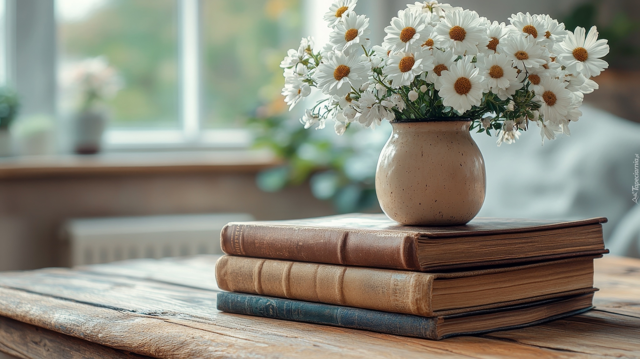 Edytor tapety: Białe margerytki w wazonie na książkach