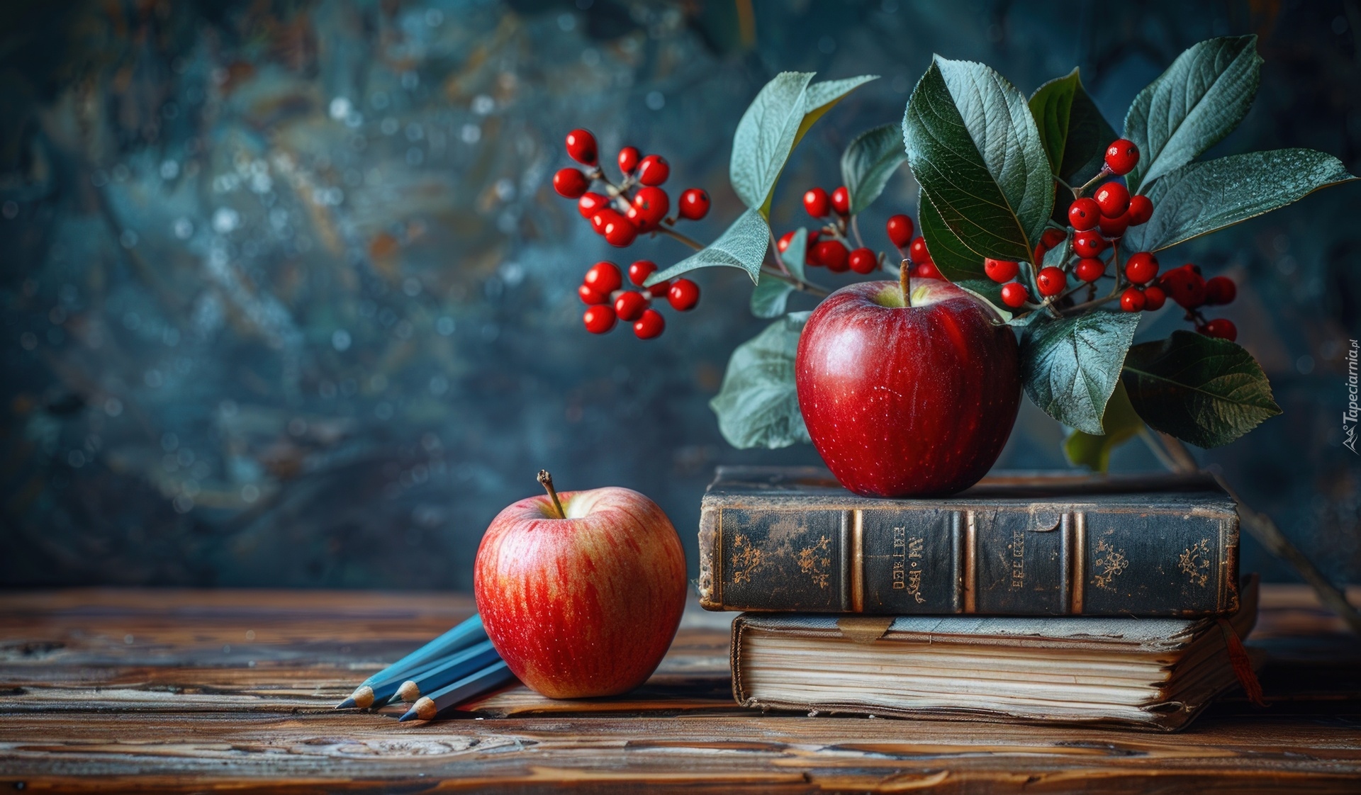 Edytor tapety: Jabłka i książki obok rośliny z czerwonymi jagodami