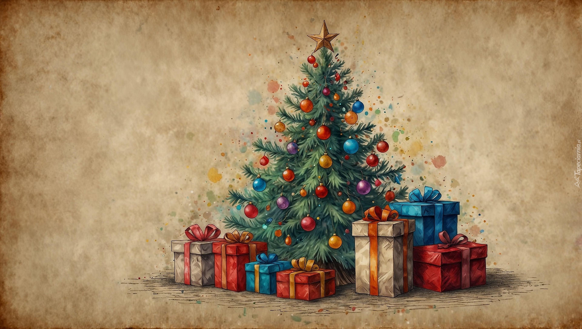 Edytor tapety: Kolorowe prezenty pod udekorowaną choinką w grafice
