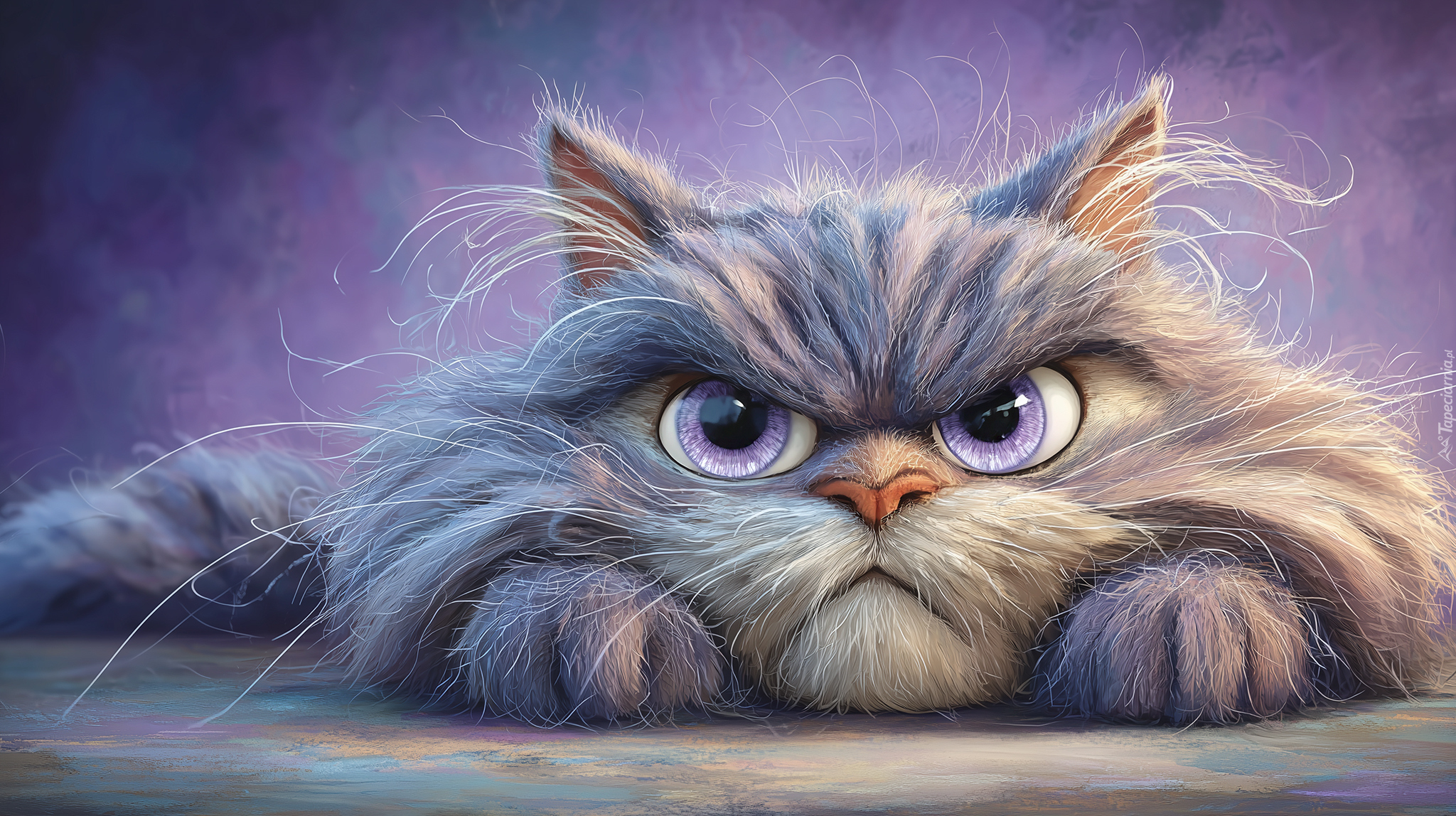Edytor tapety: Leżący fioletowo-szary kot z groźną miną