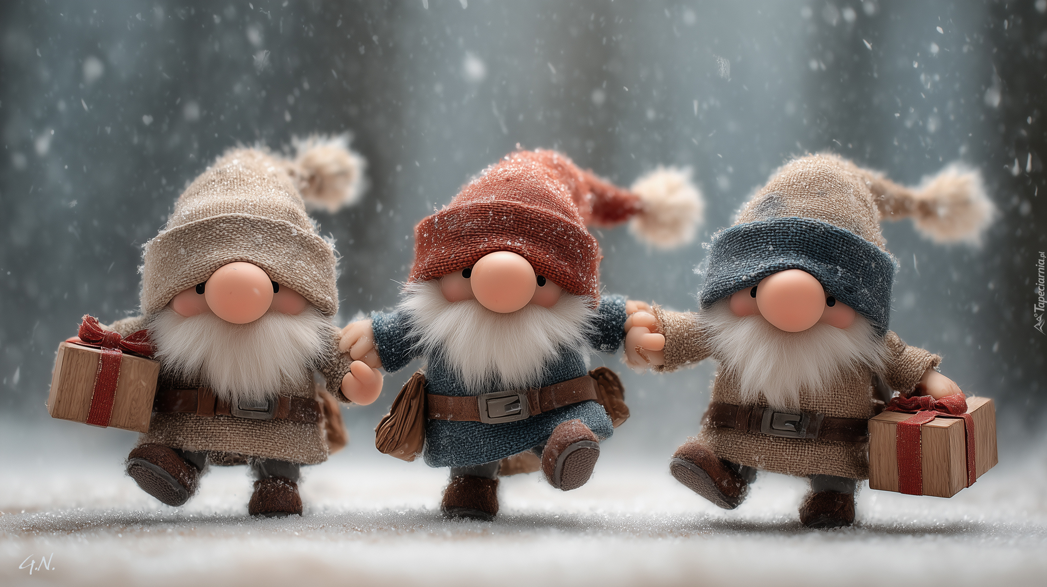 Edytor tapety: Trzy skrzaty z prezentami na śniegu