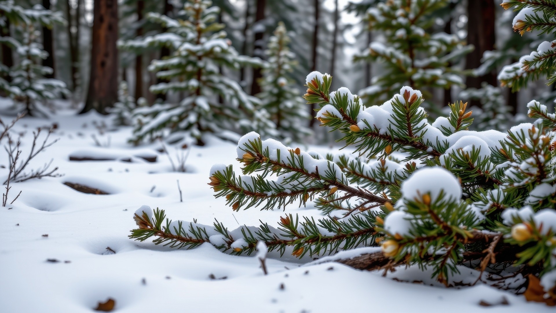 Edytor tapety: Ośnieżone iglaste gałązki na śniegu w lesie
