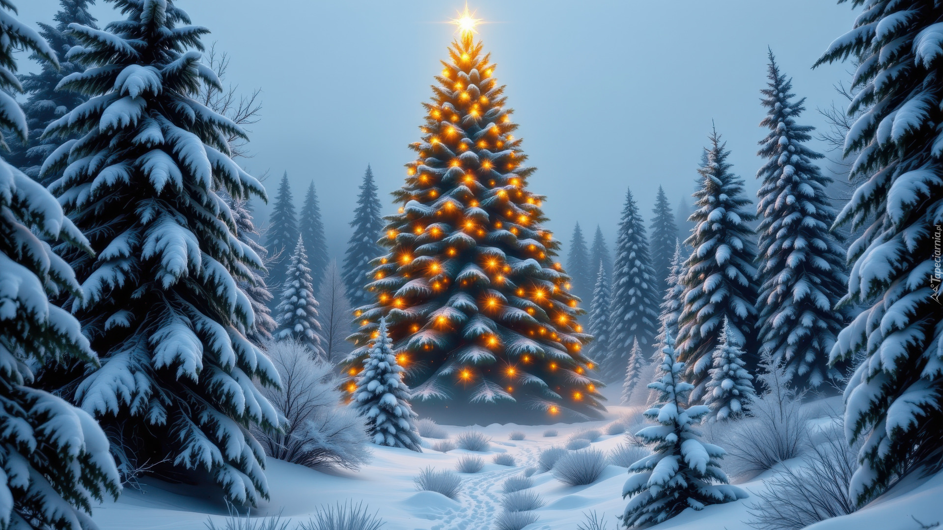 Edytor tapety: Rozświetlona choinka wśród ośnieżonych świerków w lesie