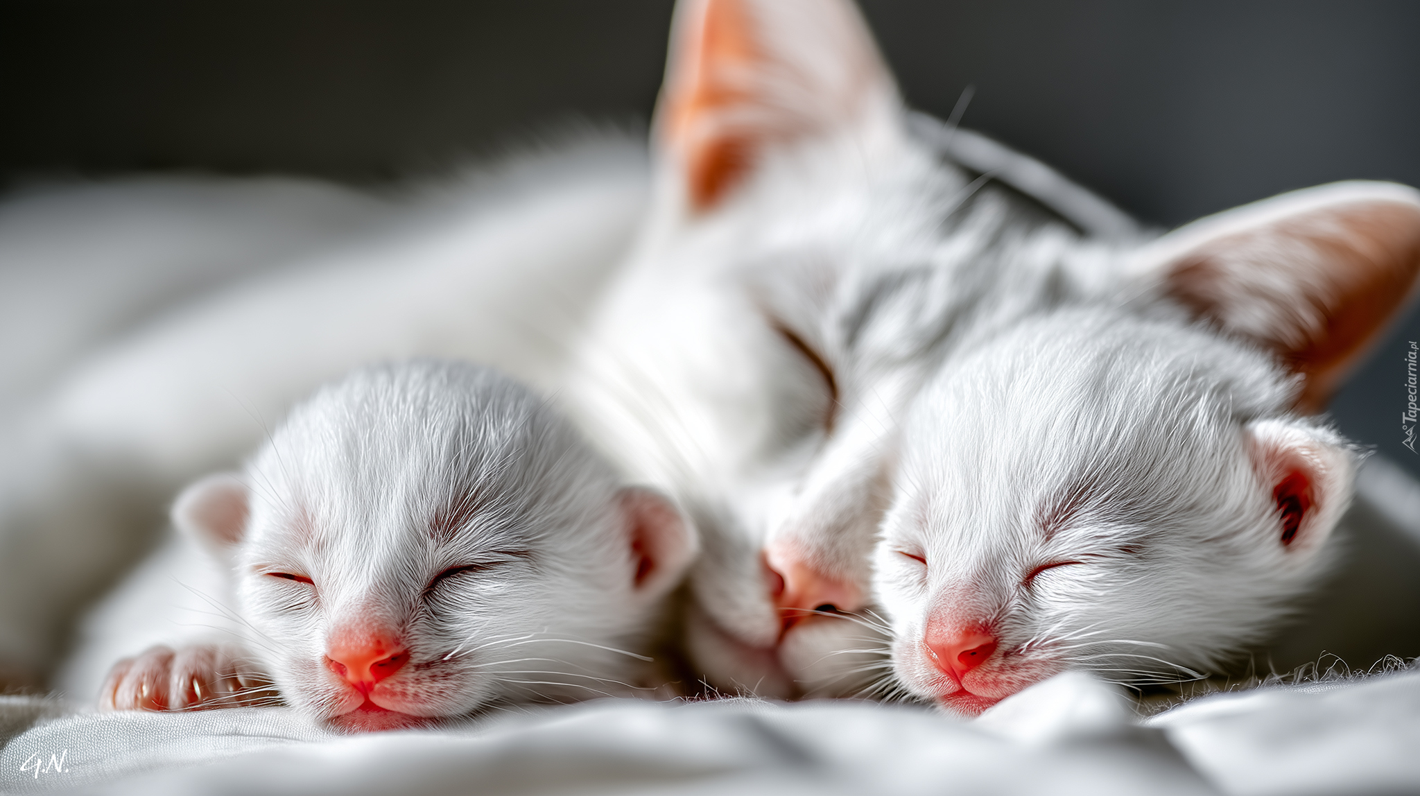 Edytor tapety: Śpiący biały kot z dwoma kociętami
