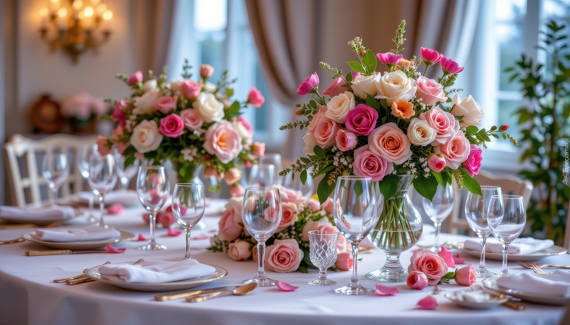 Edytor tapety: Kieliszki i bukiety róż w wazonach na stole