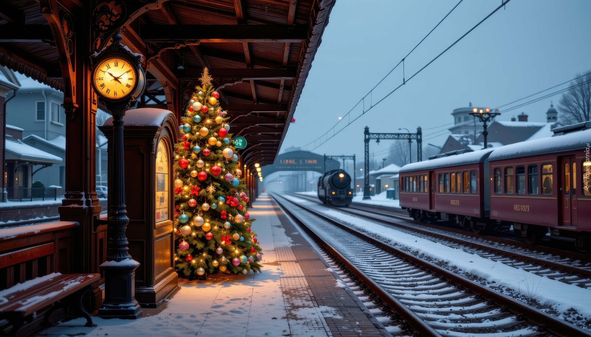 Edytor tapety: Choinka i zegar na zaśnieżonym peronie