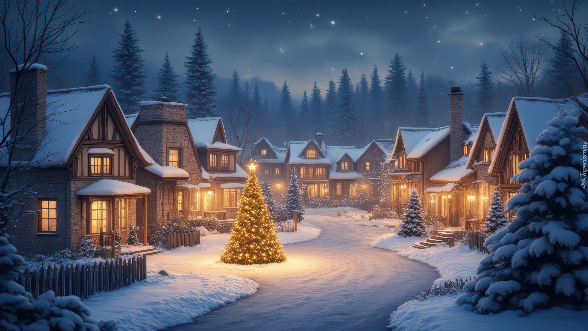 Edytor tapety: Udekorowana choinka i ośnieżone domy przy zaśnieżonej drodze