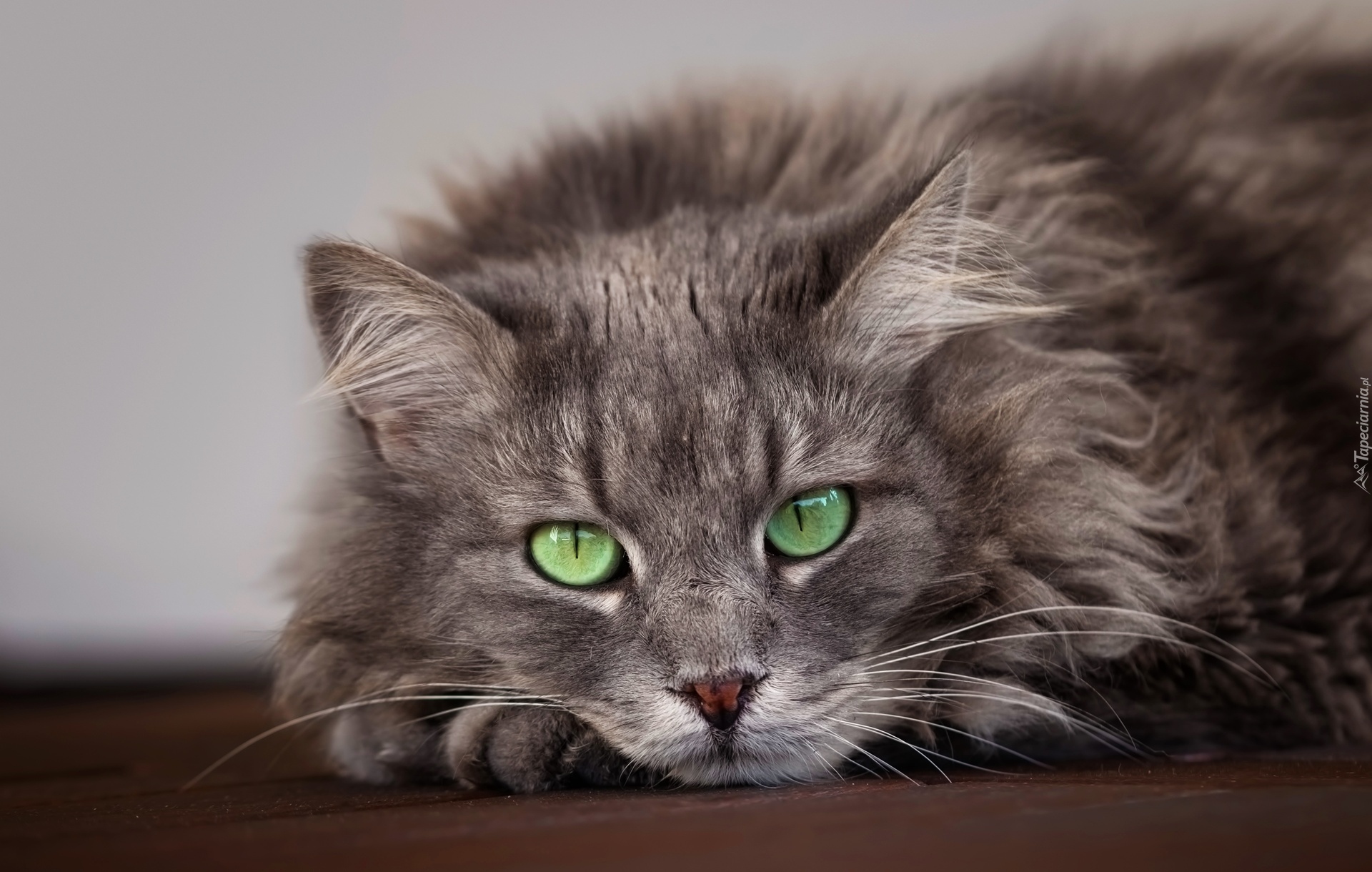 Edytor tapety: Leżący szary kot o zielonych oczach