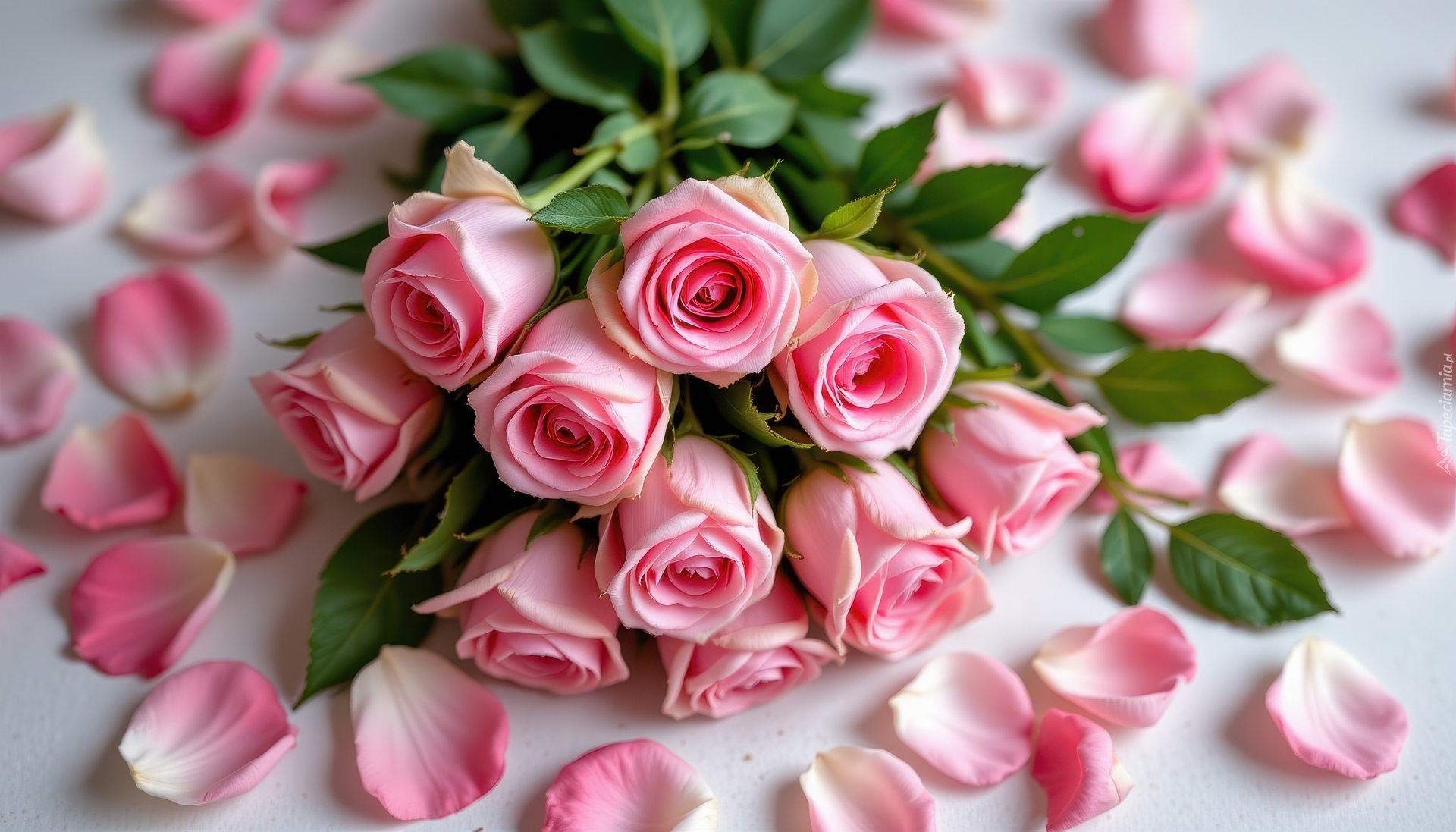 Edytor tapety: Wiązanka różowych róż i płatki na białym tle