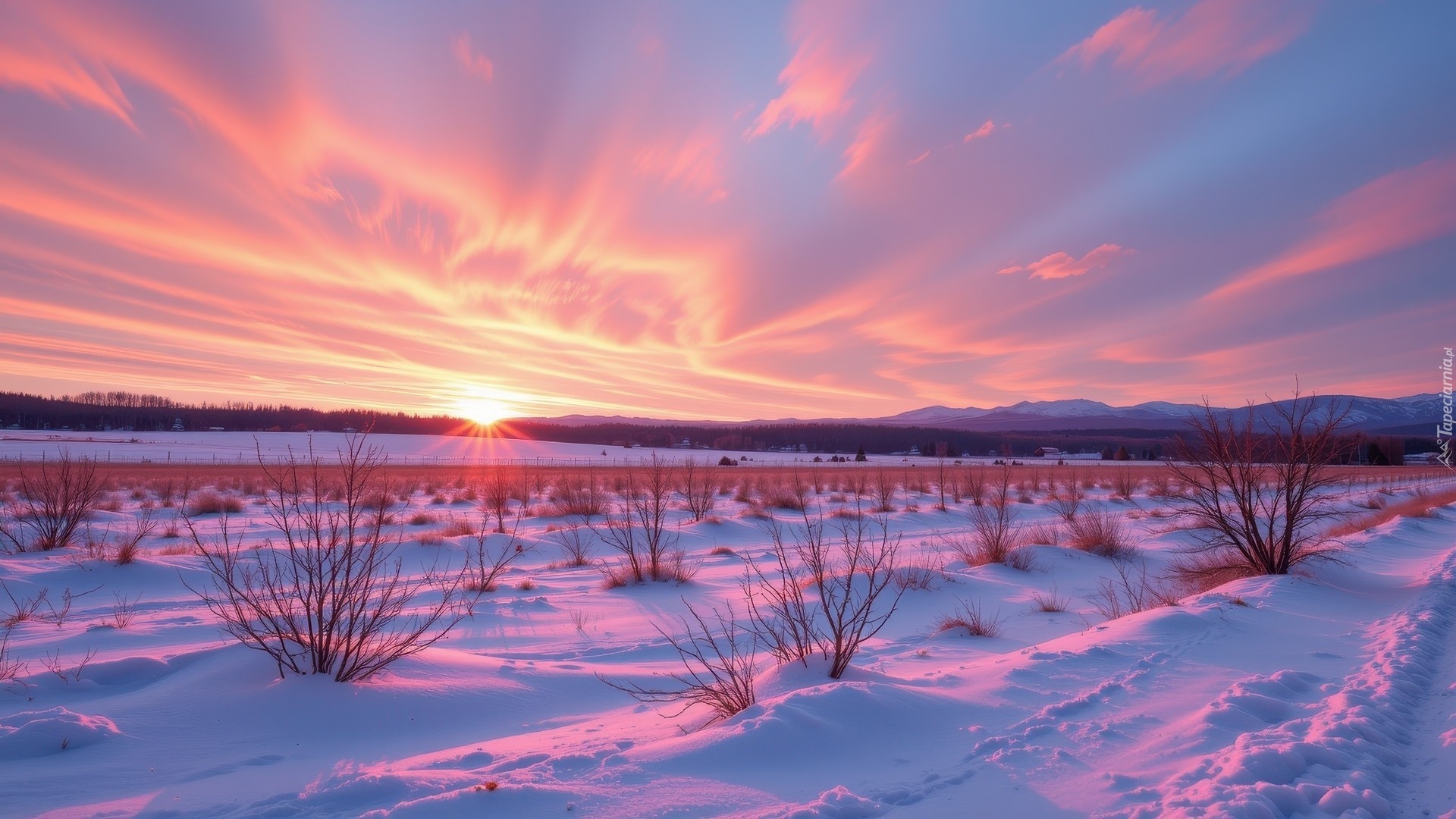 Edytor tapety: Ośnieżone pola pod kolorowym niebem o zachodzie słońca