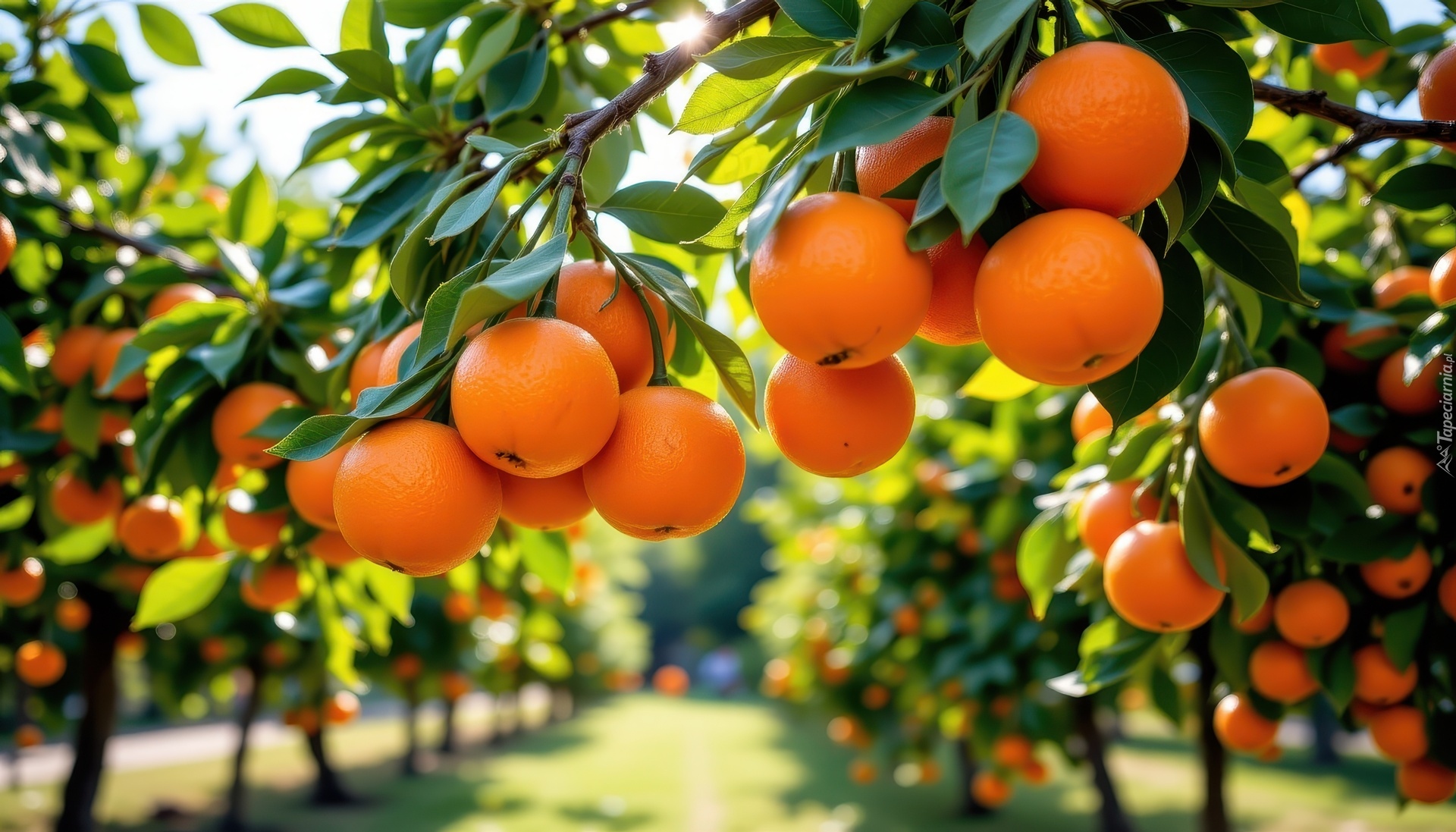 Edytor tapety: Pomarańcze na gałęziach drzew w sadzie