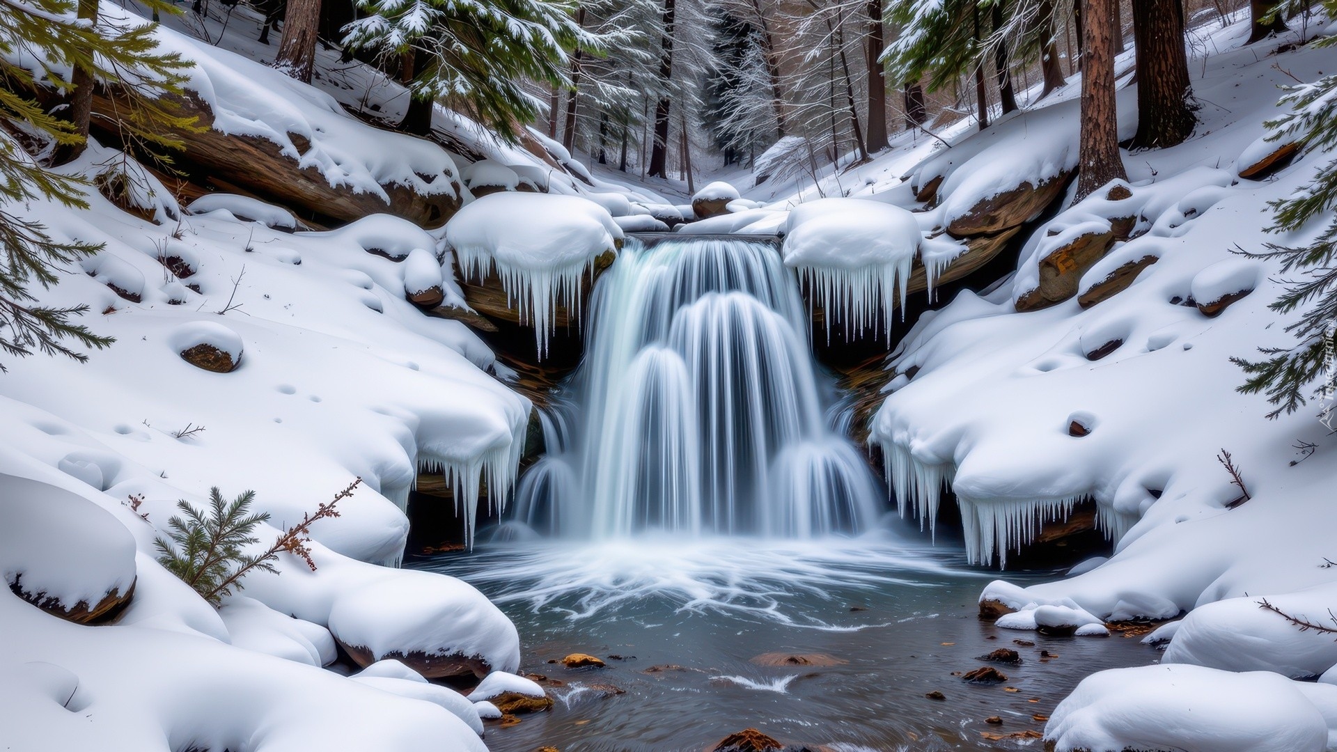 Edytor tapety: Uskok na leśnej rzece ze zwisającymi soplami