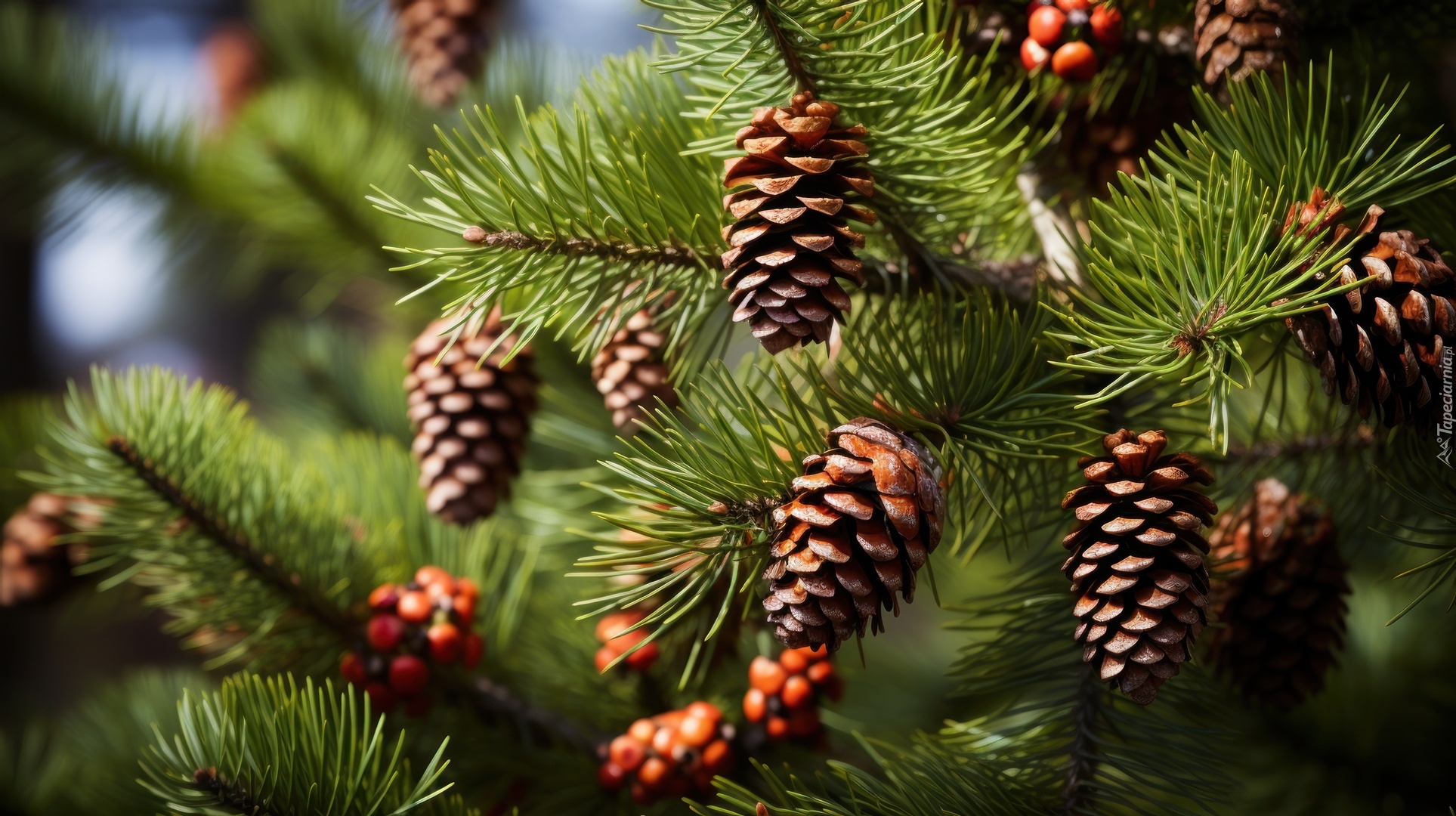 Edytor tapety: Gałązki sosny z szyszkami w zbliżeniu