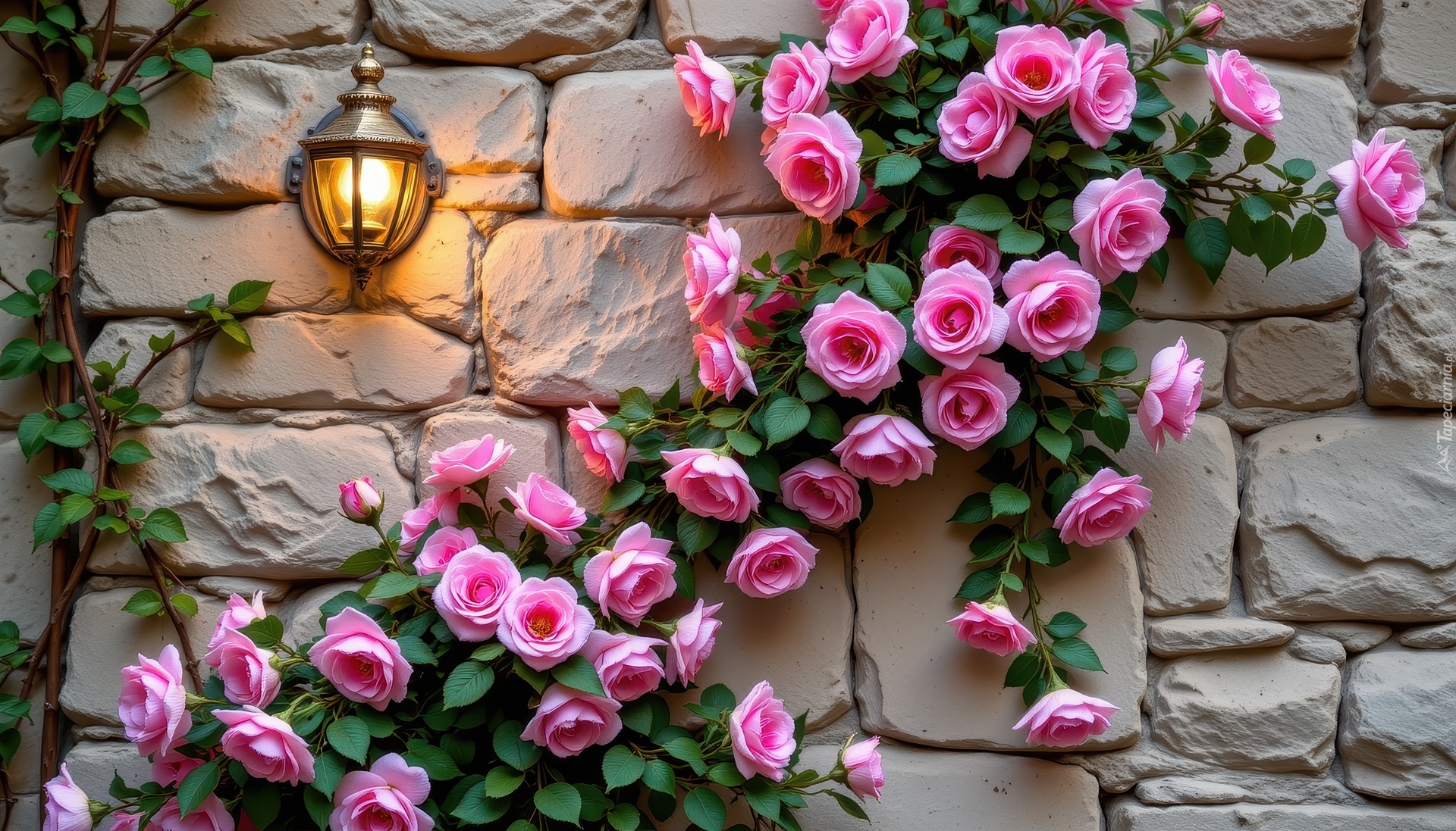 Edytor tapety: Zapalona lampa i różowe pnące róże na murze