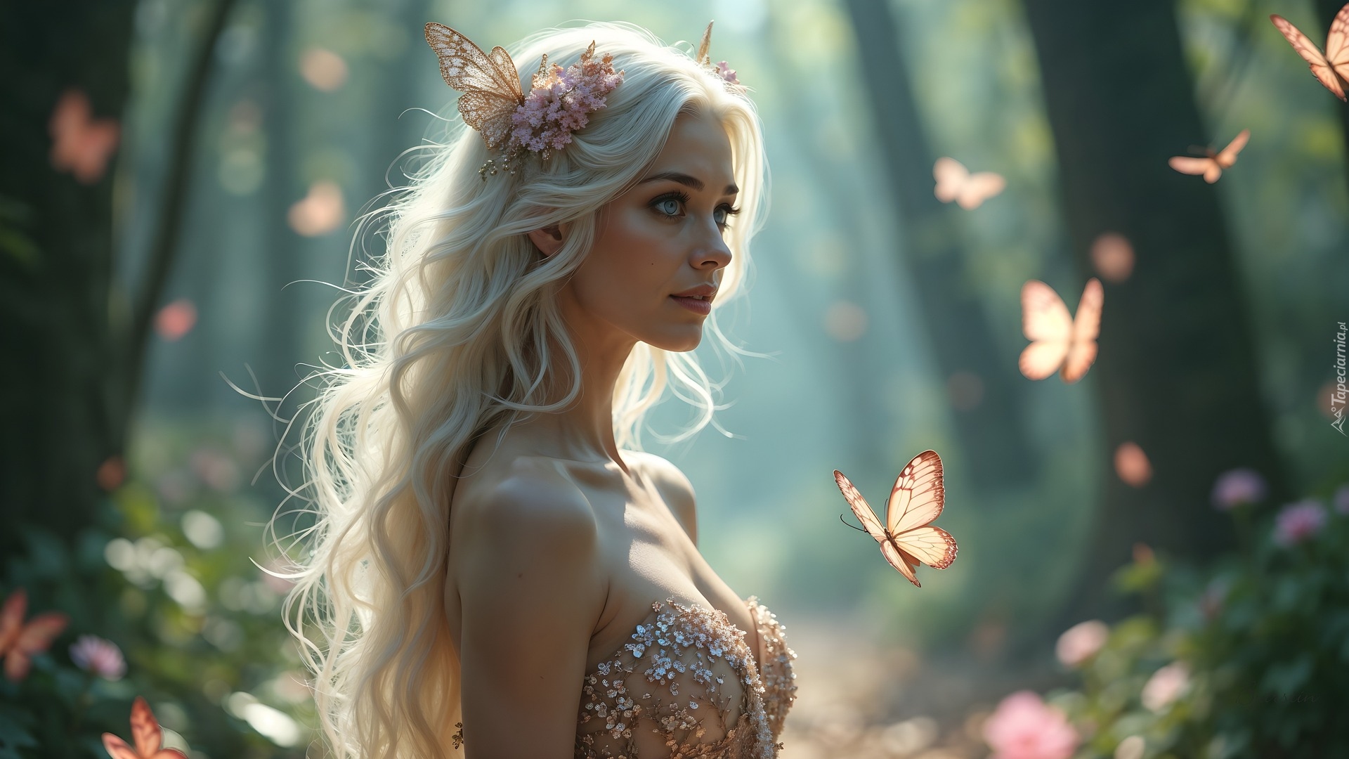 Edytor tapety: Długowłosa blondynka i motyle w blasku słońca