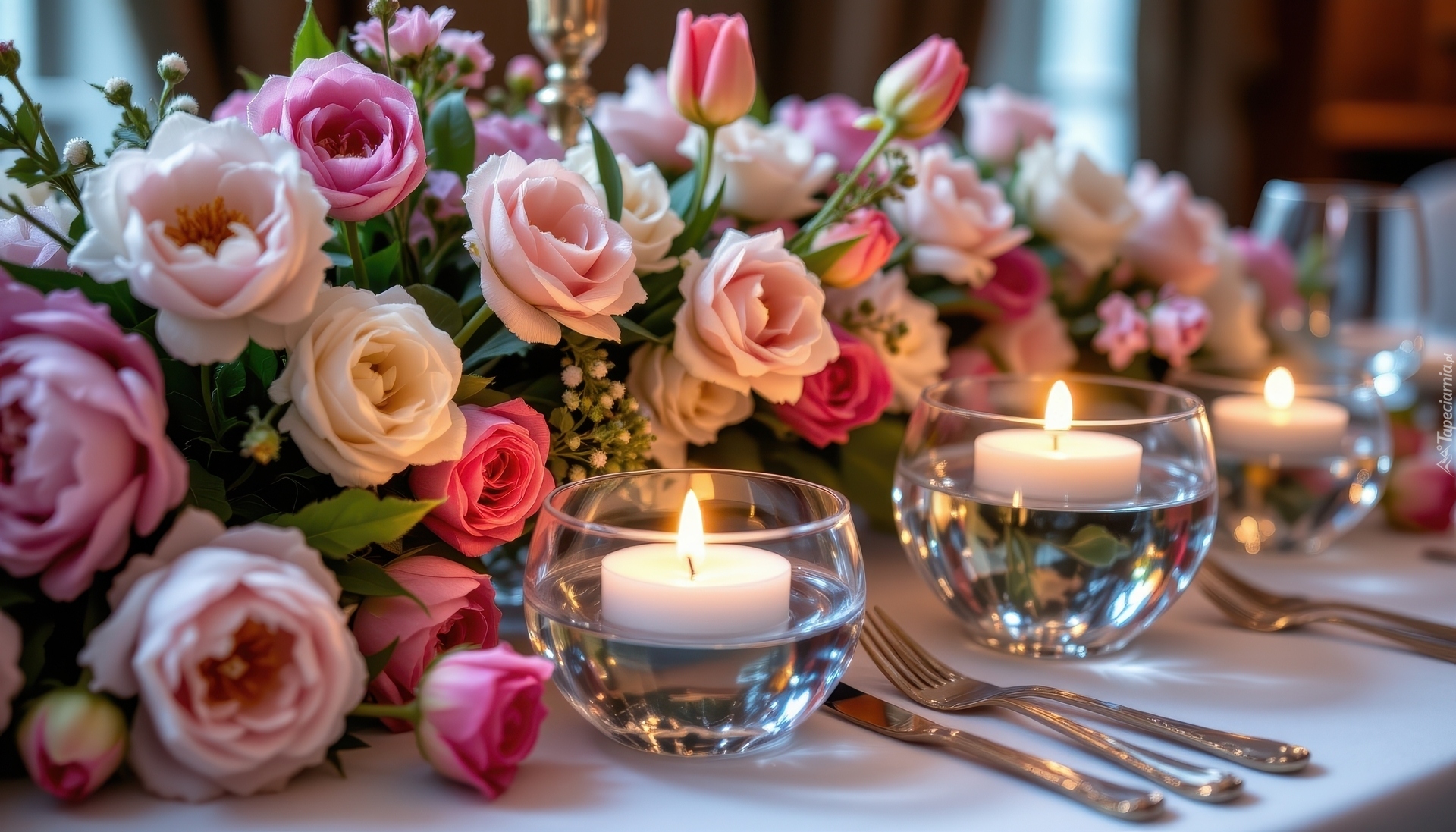 Edytor tapety: Zapalone świece i sztućce obok róż na stole