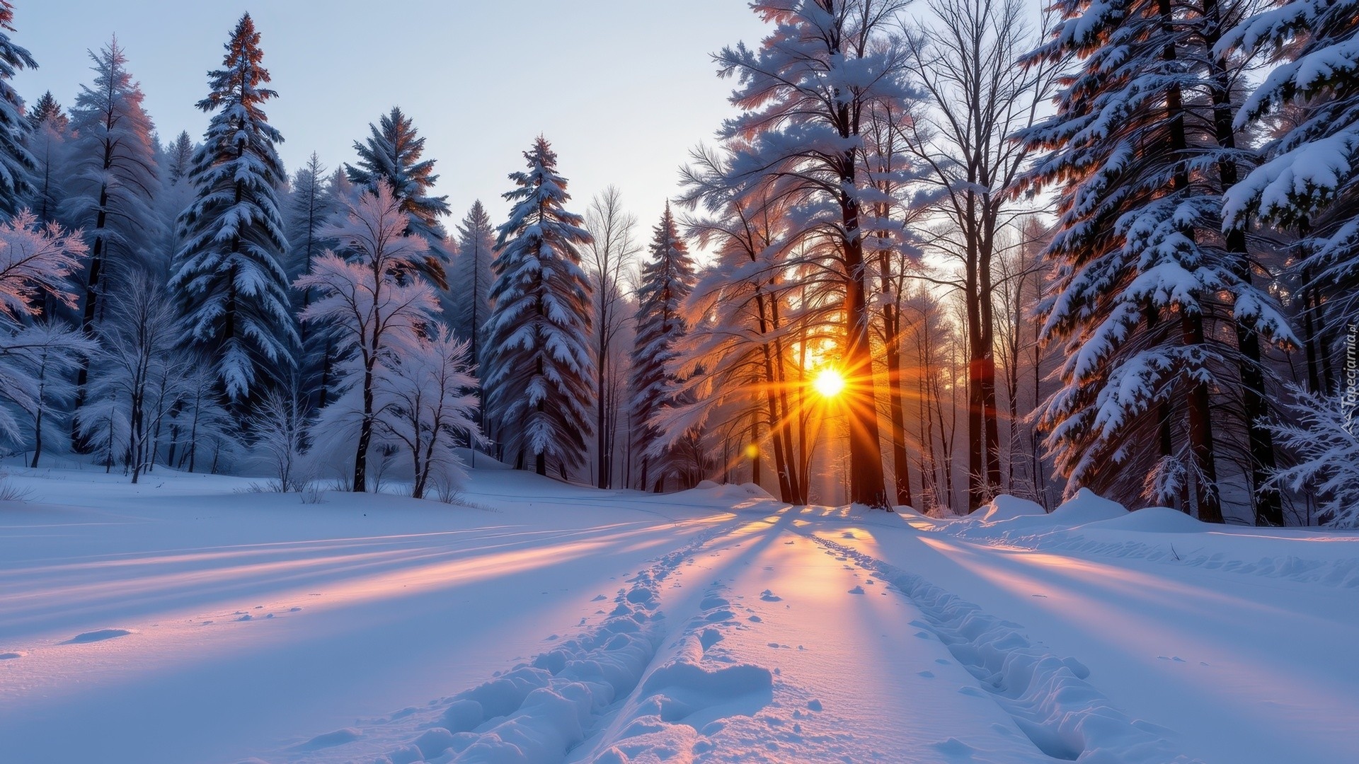 Edytor tapety: Zaśnieżona droga i ośnieżone drzewa w promieniach słońca