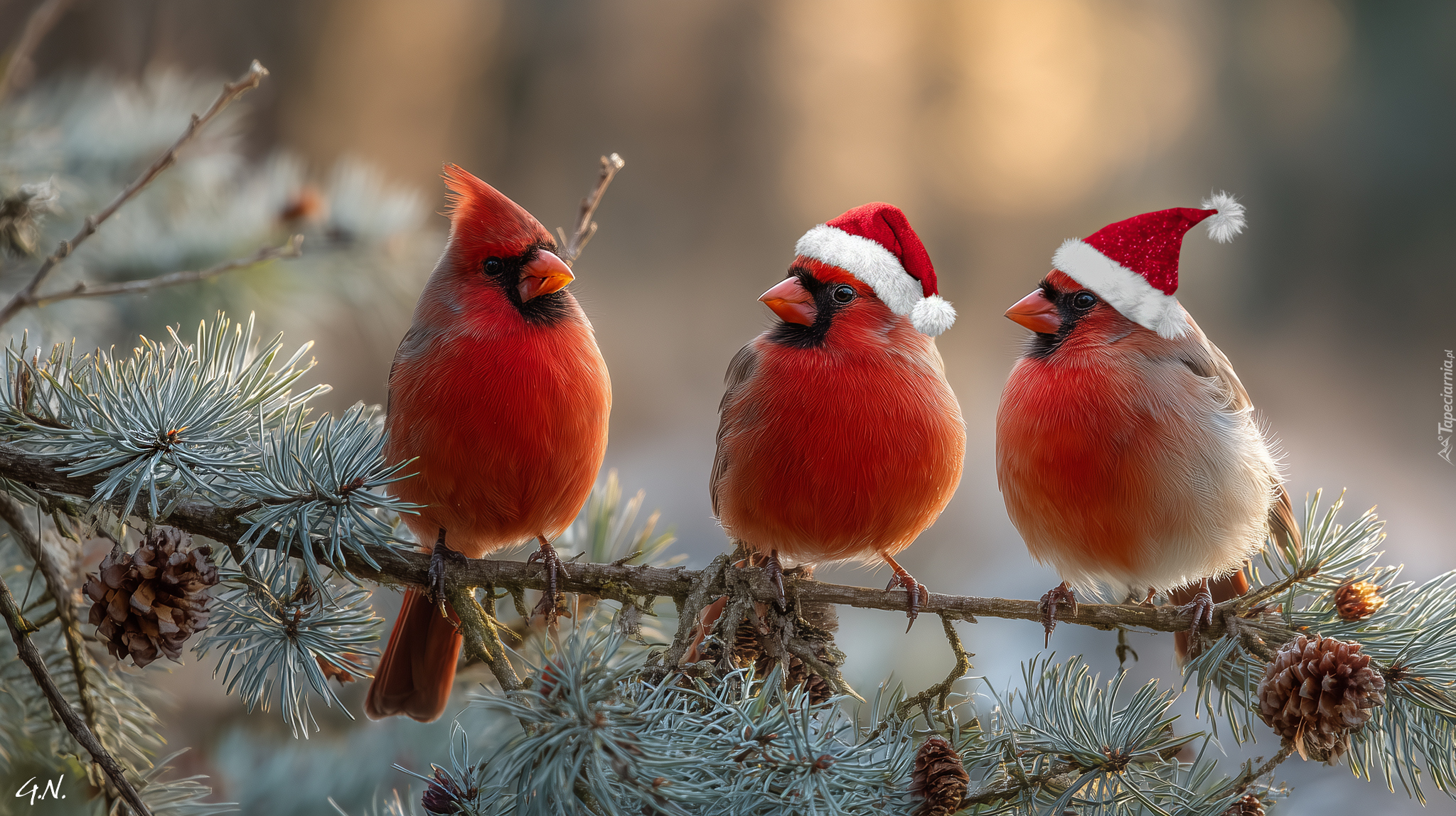 Edytor tapety: Trzy kardynały w czapeczkach Mikołaja na sosnowej gałązce