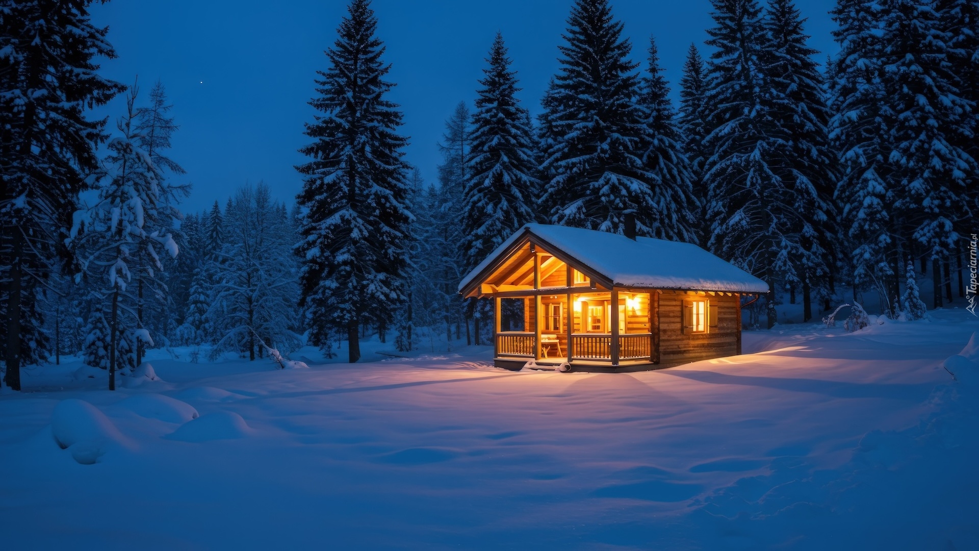Edytor tapety: Oświetlony nocą drewniany dom w zimowym lesie