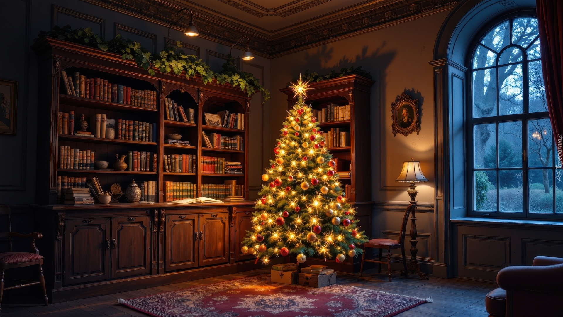 Edytor tapety: Oświetlona choinka obok regałów z książkami w pokoju