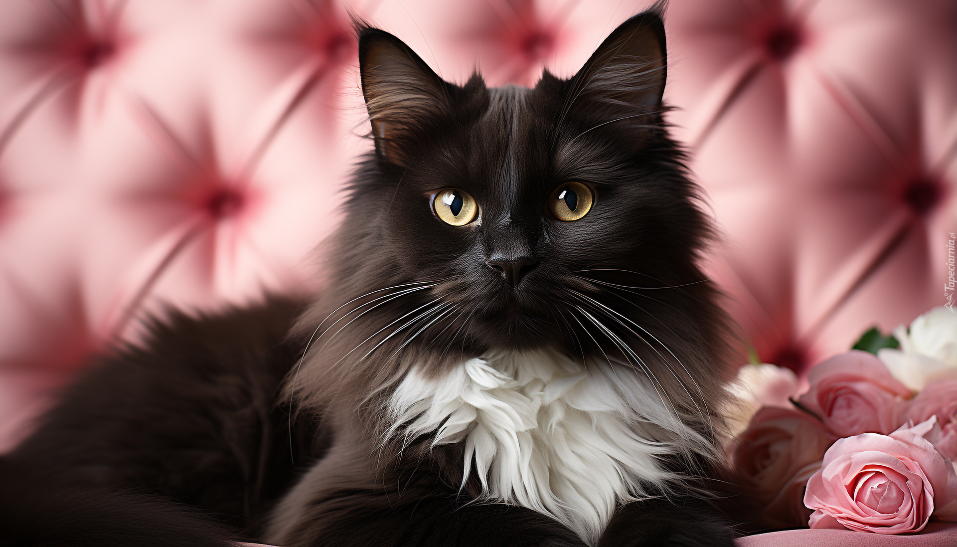 Edytor tapety: Leżący czarno-biały kot obok różowych róż