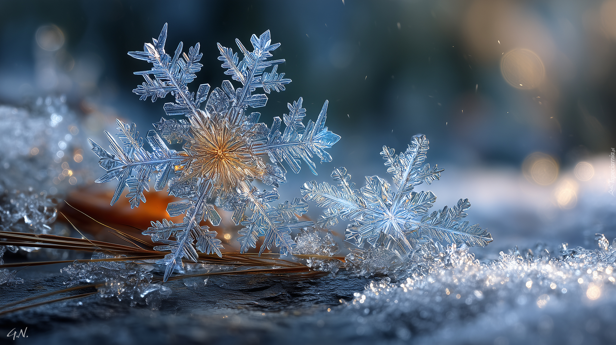 Edytor tapety: Dwie śnieżynki na śniegu w AI