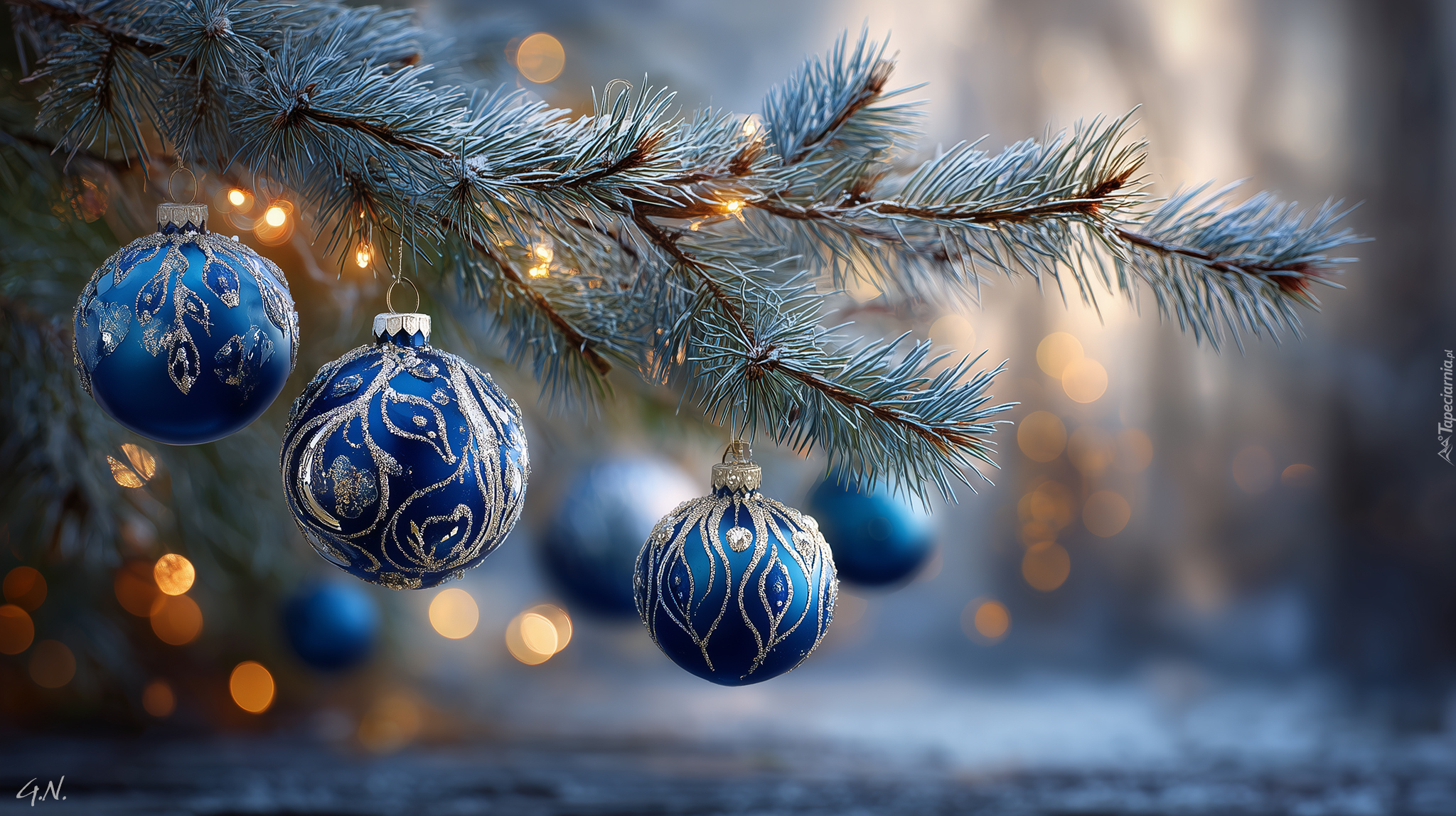 Edytor tapety: Niebieskie bombki na sosnowych gałązkach