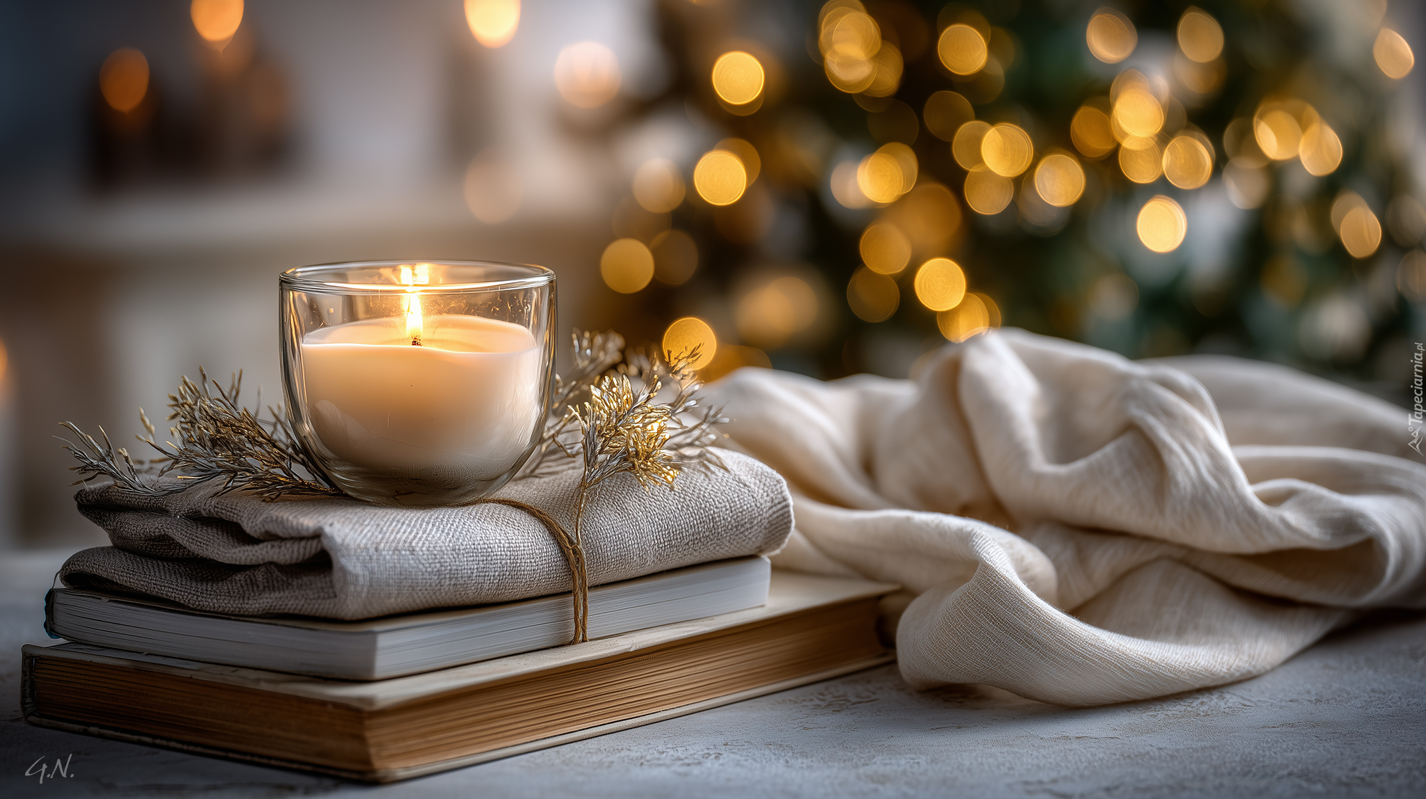 Edytor tapety: Zapalona świeca na tkaninie i książkach