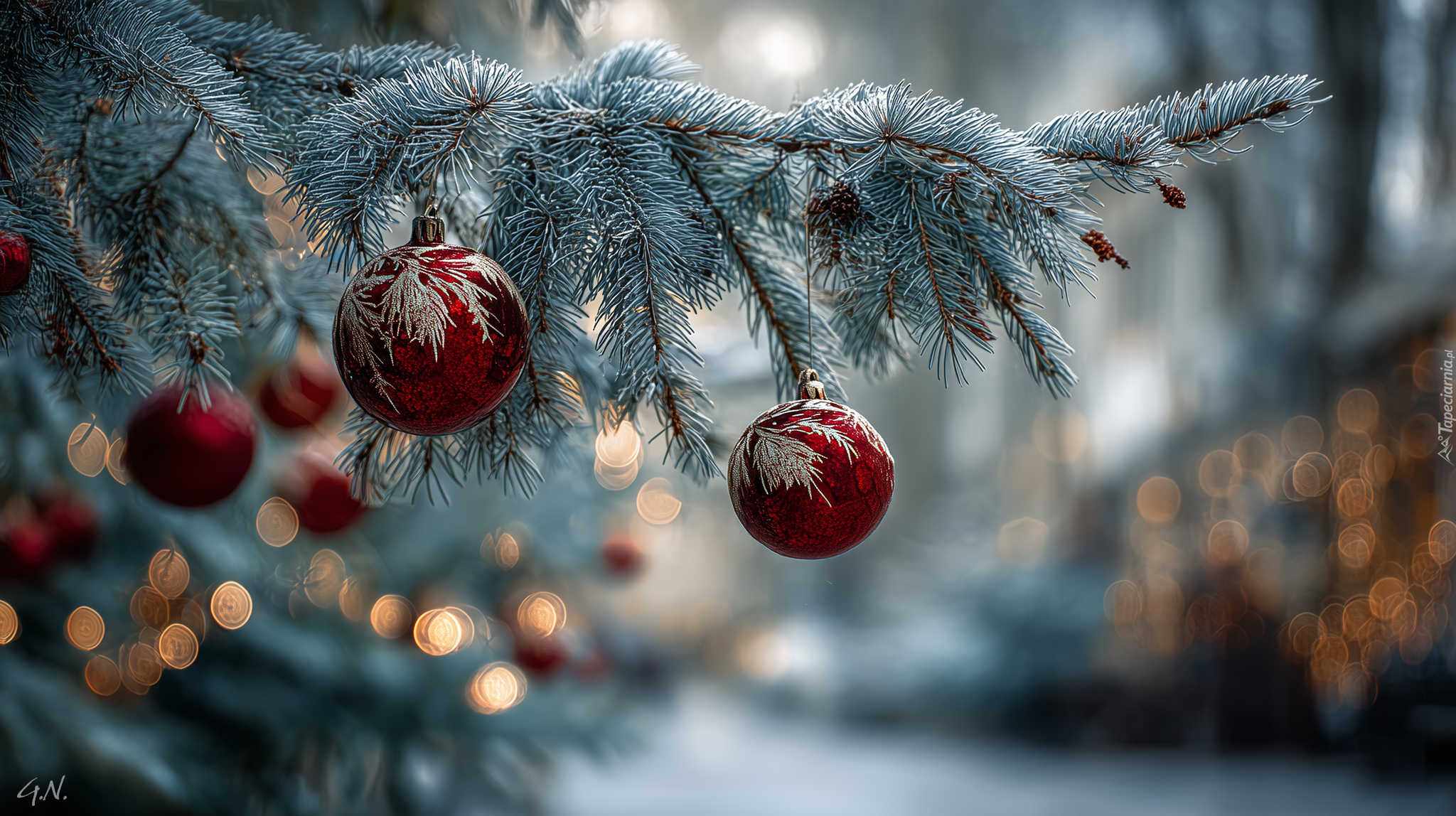 Edytor tapety: Czerwone bombki na gałązkach świerku