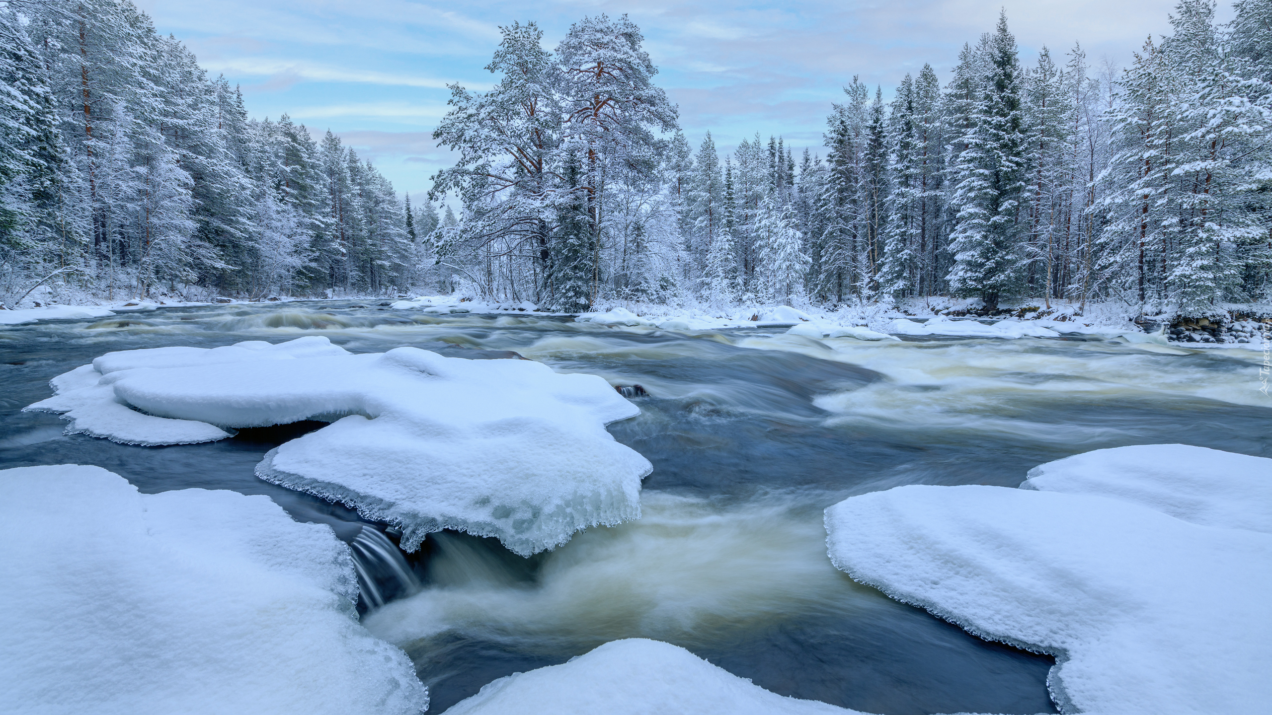 Edytor tapety: Ośnieżone drzewa i lód na rzece zimową porą