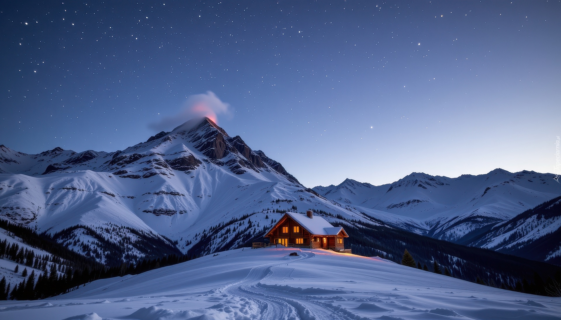 Edytor tapety: Oświetlone nocą schronisko na tle ośnieżonych gór