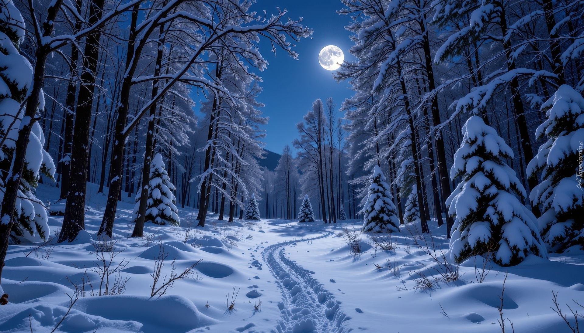 Edytor tapety: Zimowy las i droga w księżycowym blasku