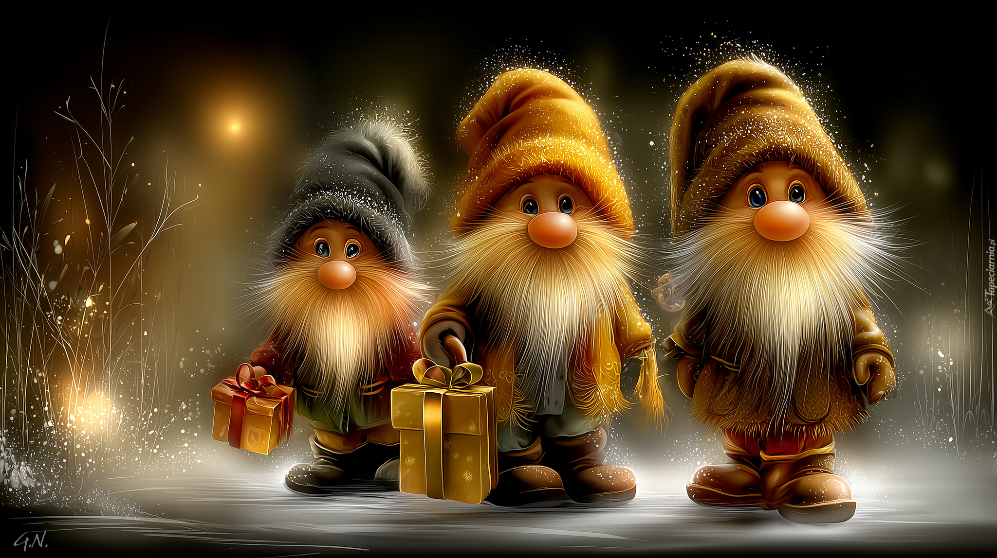 Edytor tapety: Trzy skrzaty w czapkach i z prezentami