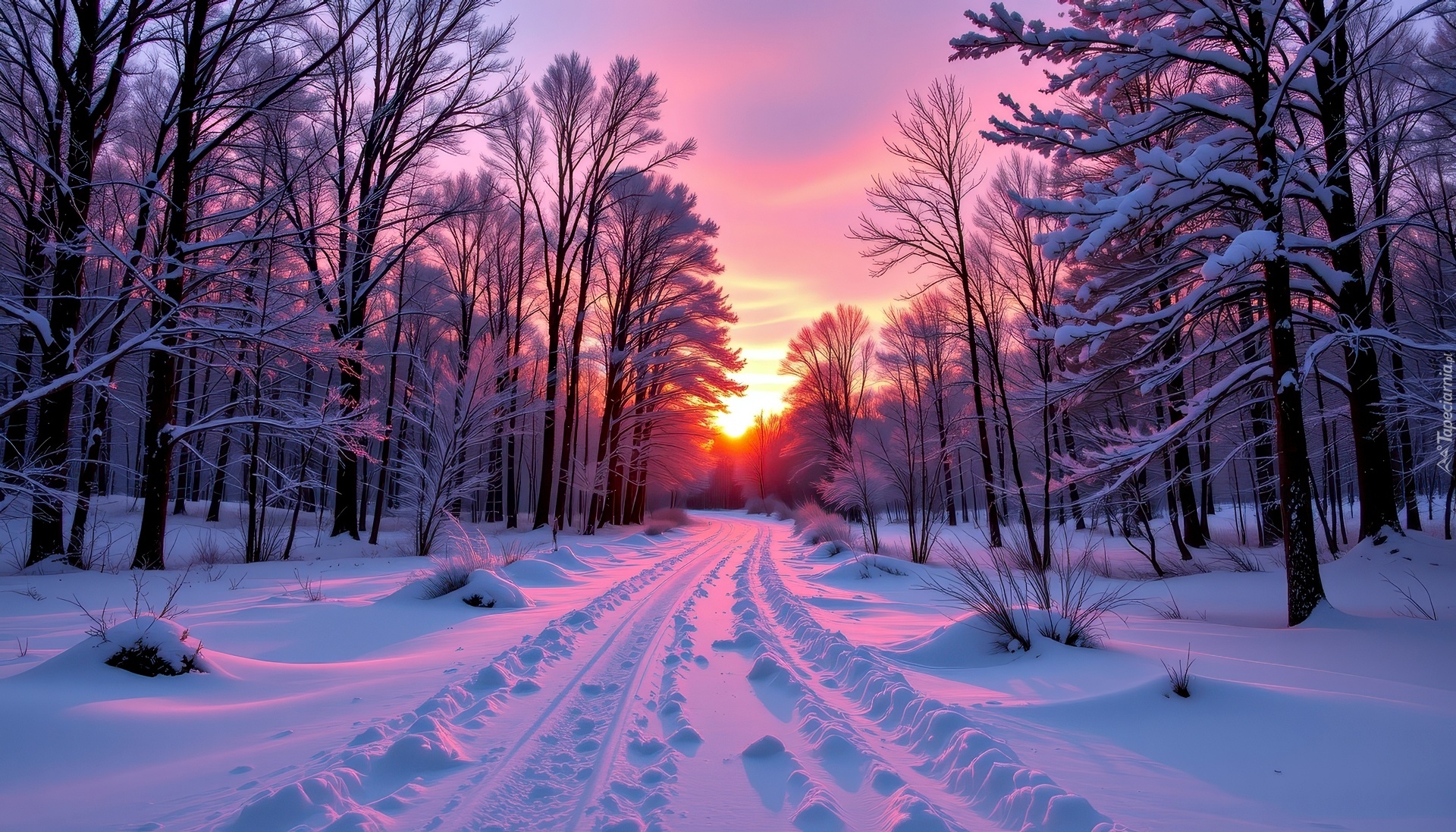Edytor tapety: Ośnieżone drzewa przy zaśnieżonej drodze o zachodzie słońca