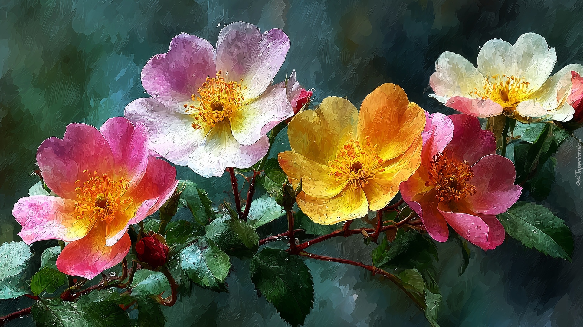 Edytor tapety: Rozkwitnięte kolorowe róże i liście na gałązce